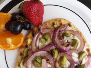 Posted: March 26, 2012 Filed under: Appetizers, Breads, Main Dishes, Uncategorized | Tags: almond cheese, caramelized onions, flat bread, Naan bread, pistachios, pizza, vegan, vegetarian Leave a comment