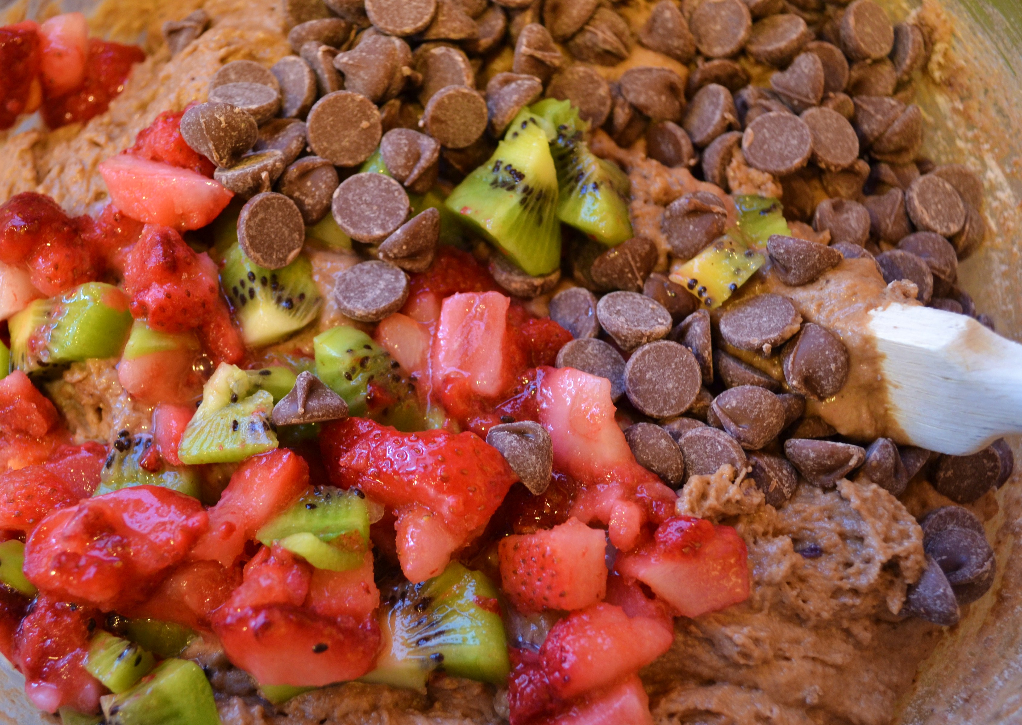 To that end, I offer you this recipe for Double Chocolate Berry Nut Muffins. If I’d had blueberries or dark cherries on hand, I would have used those in this muffin. What I did have on hand was strawberries and kiwis, so improviser that I am… into the bowl they went. I’ve never let lack of correct ingredients stop me from whipping up a recipe. I once made a carrot cake without any carrots, subbing zucchini and crushed pineapple. It was delicious.