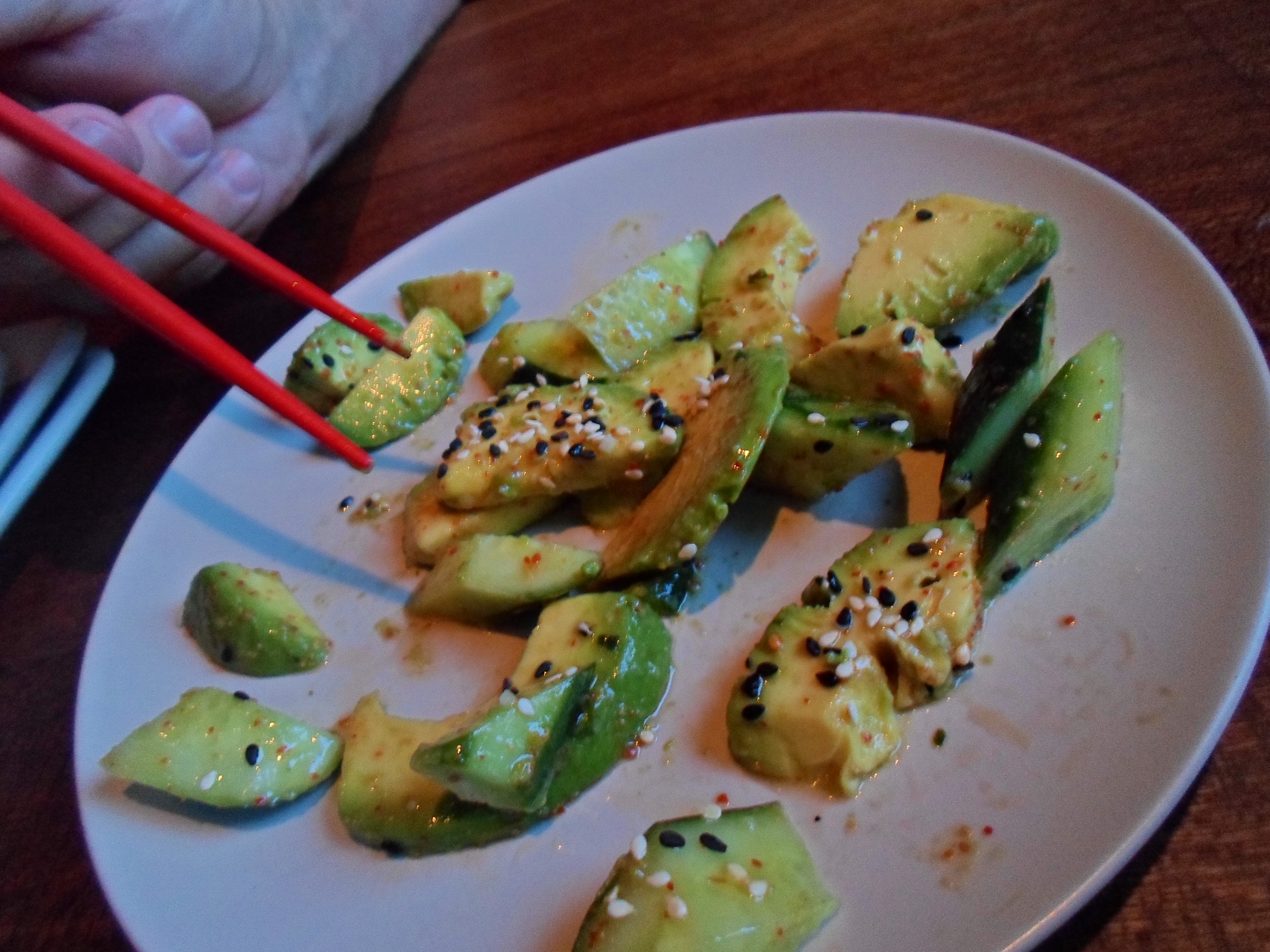 We began by sharing an avocado and cucumber sesame salad. It was a simple salad: chunks of avocado and cucumber, tossed in sesame oil and sesame seeds. What made it over the top was the sprinkling of flaky, kosher sea salt.