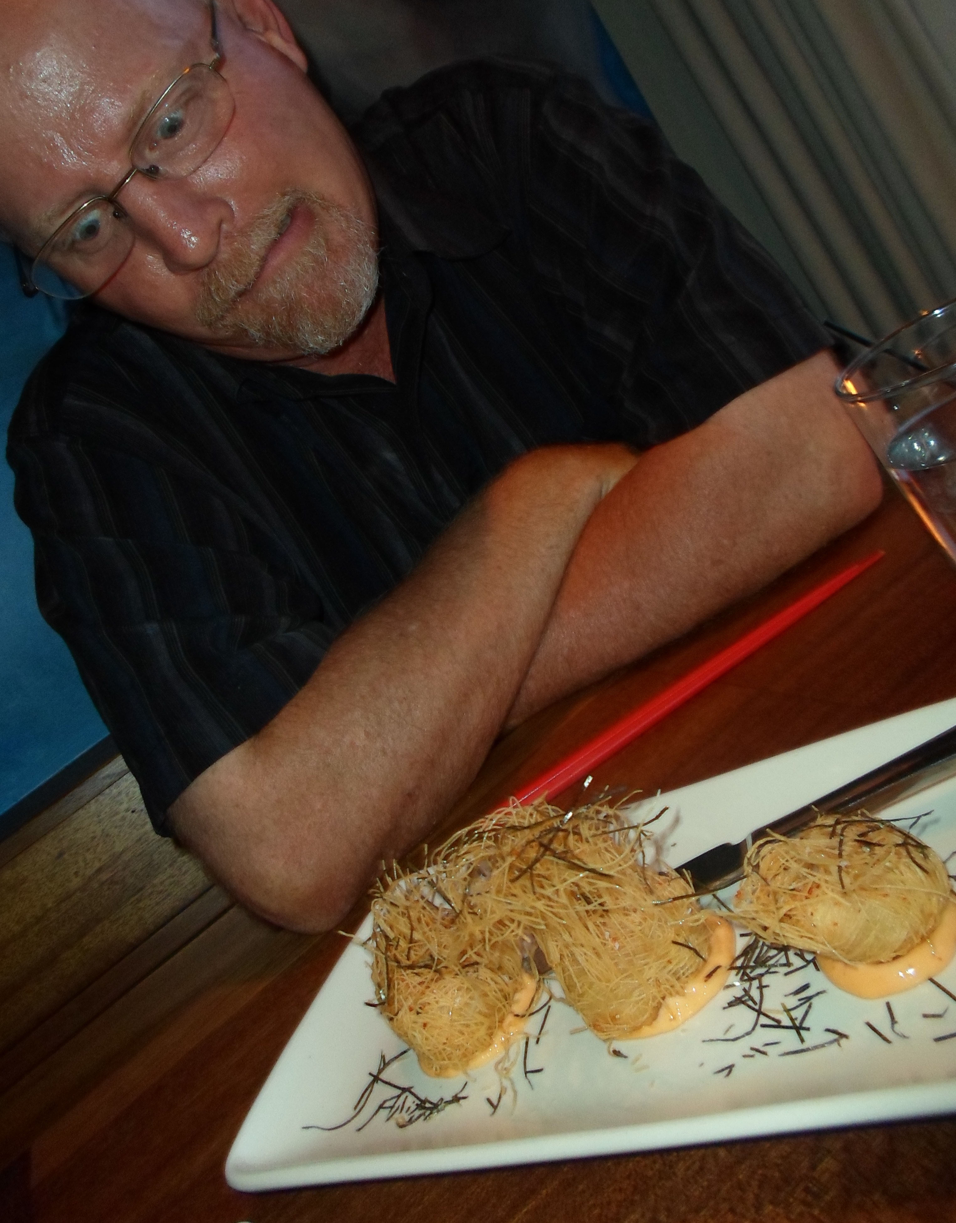 This was followed by three little straw purses of divine yumminess: phyllo dough somehow made into thread-like strips, wrapped around three huge sea scallops and twisted so that the straw “hair” stuck straight up in pony tail fashion. They were sitting on a dollop of some sort of rich sauce – perhaps a cocktail sauce blended with heavy cream and a squeeze of fresh lime? Greg looked dubious. Then he tried a bite, and smiled, rolling his eyes heavenward. My meat and potatoes man was, at long last, being seduced by foodie fare.