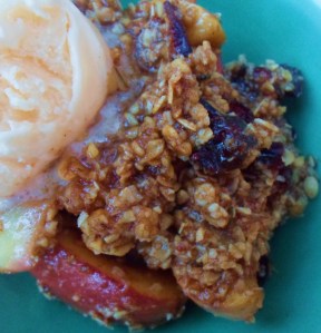 Bake at 350 degrees for about 30 minutes or until topping is brown, apples are soft and juices beneath are thick and syrupy. Top with pumpkin seeds, if desired. Serve plain or with a scoop of vanilla ice cream, yogurt or coconut milk-based ice cream.
