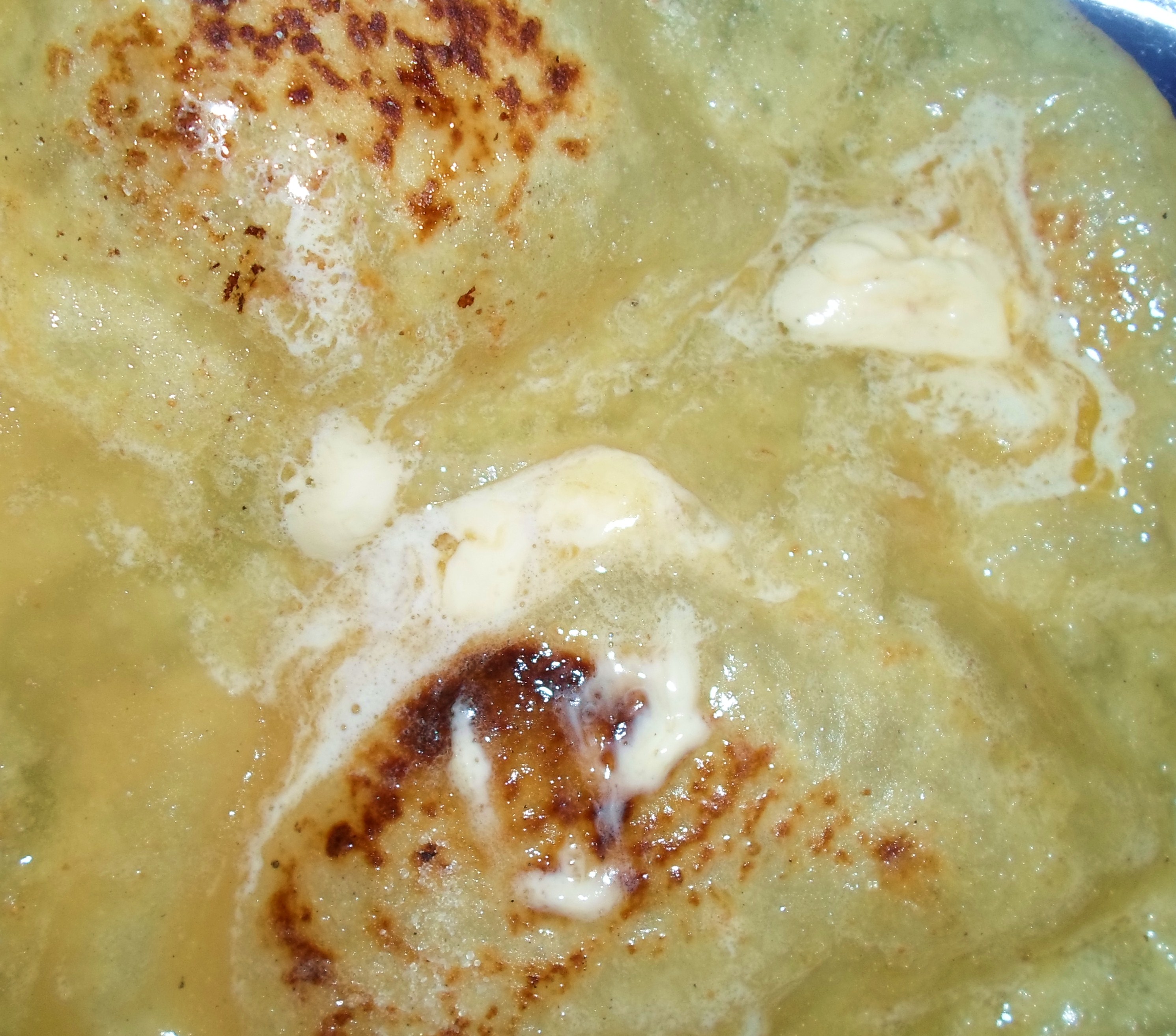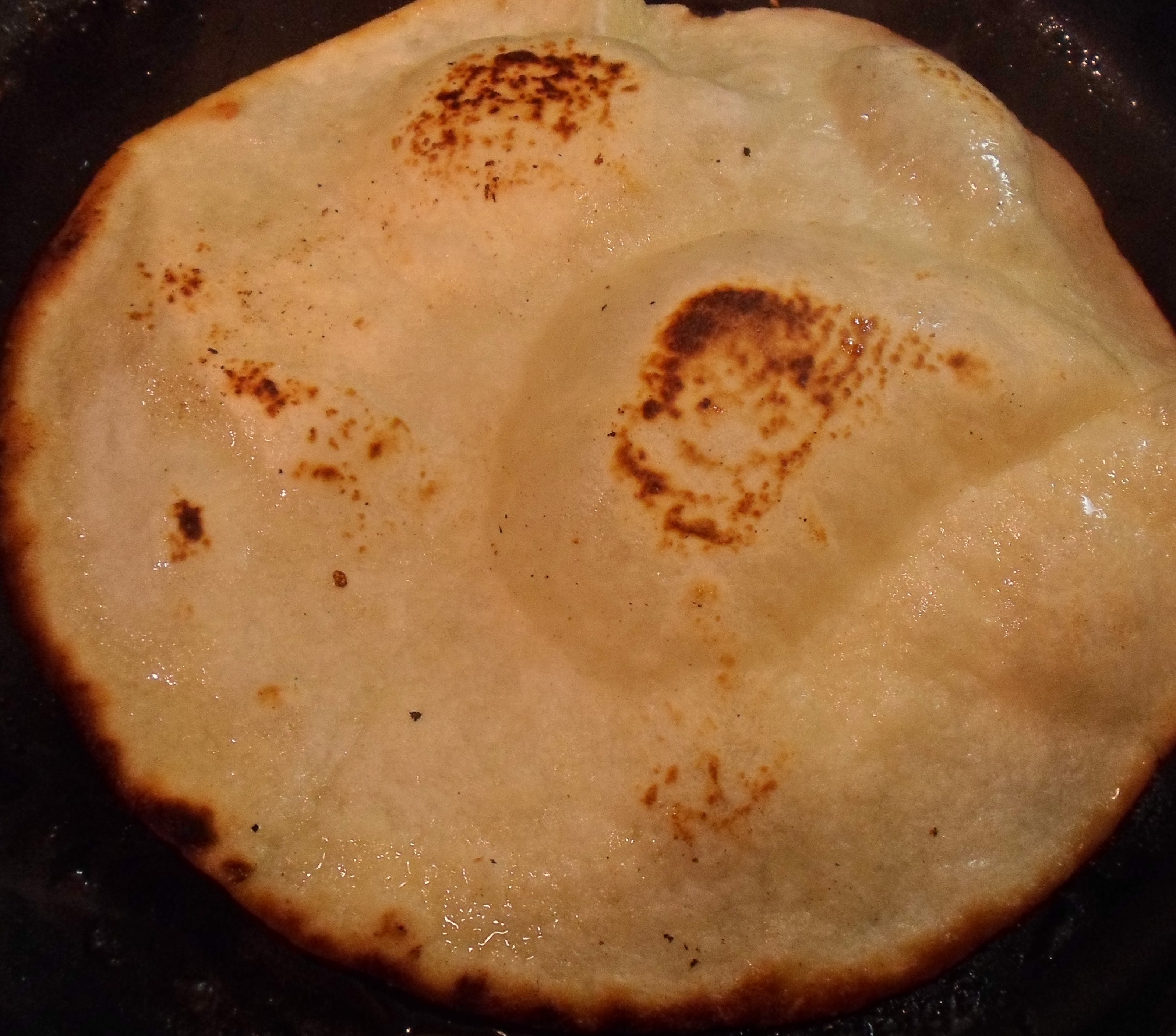 Put 1 t. olive oil and 1 t. soft butter in a hot skillet, and stir until blended. Put one uncooked tortilla in the pan. When it puffs up and browns on one side, flip it and brown the other side.
