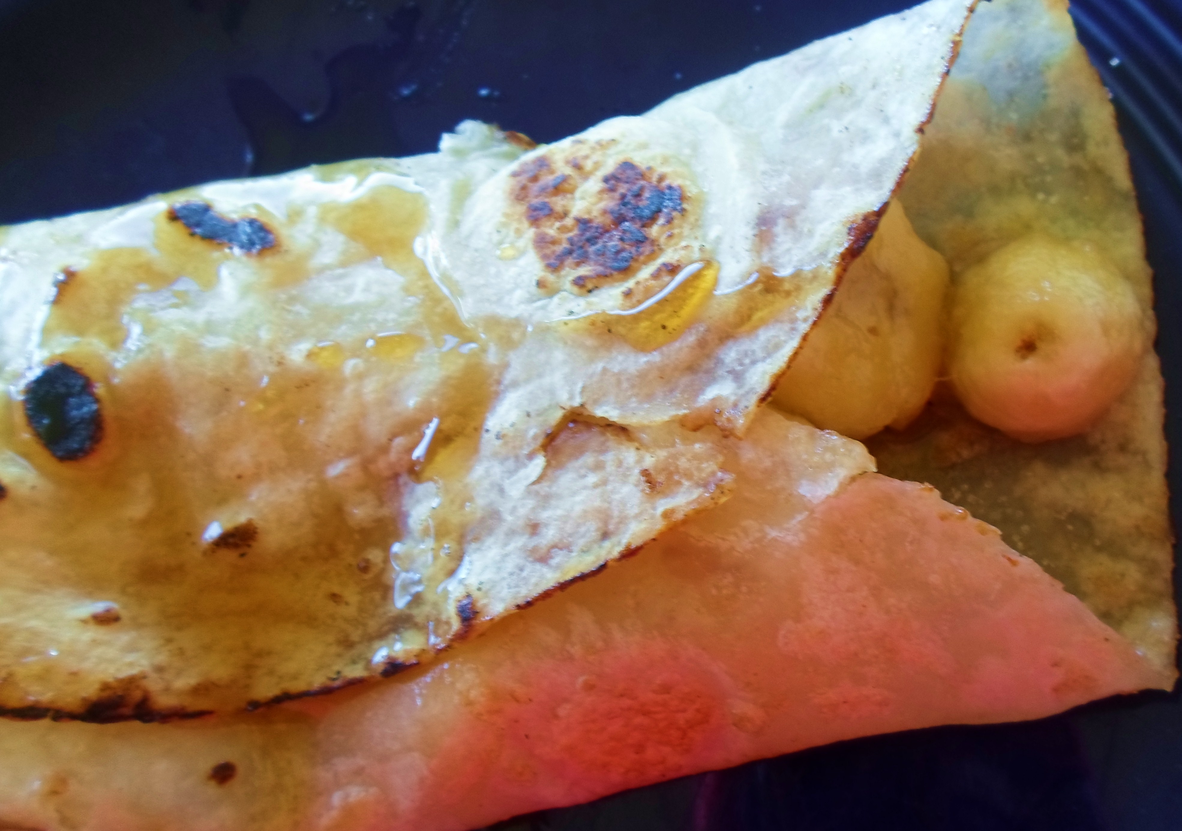 For banana sopapillas: slice one small banana and put in a skillet with a teaspoon of butter and a teaspoon of brown sugar. Stir just until bananas are warm and absorb butter and sugar. Proceed as above, only fill the tortilla with warm banana slices, roll like a burrito and serve with a little more honey. Eat with knife and fork. A dollop of ice cream and sprinkle of cinnamon couldn’t hurt either.