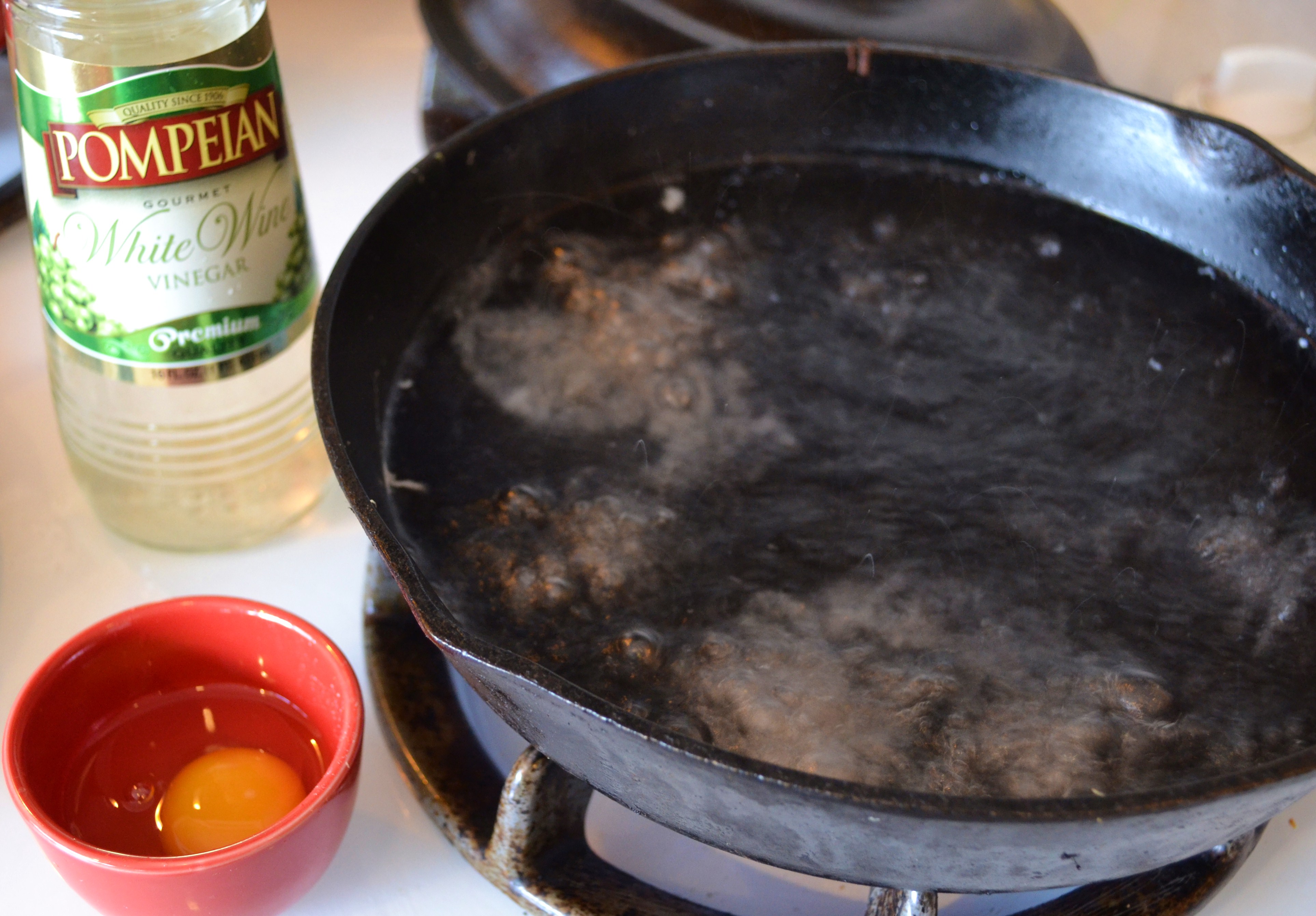 Fill a small skillet 2/3 full with hot water. Add 2 t. white vinegar. Bring to boil. Carefully crack at egg into a small heat-proof bowl. Slip it carefully into the boiling water. Repeat with other egg.