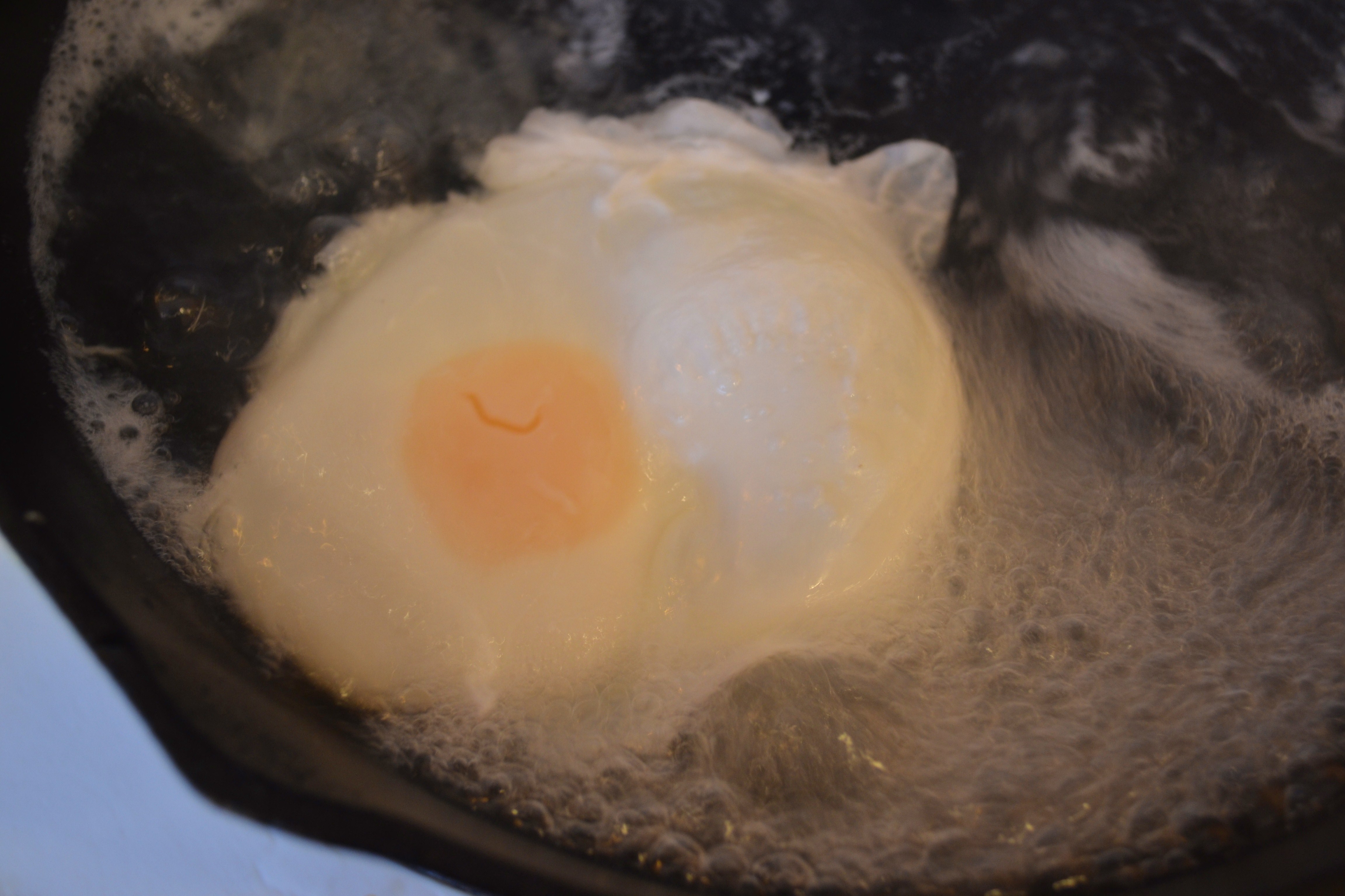 Some of the white will float away, like foamy clouds. That’s okay. You can capture them later with a slotted spoon and eat them or ignore then and toss them away with the “bath water.” Cook about a minute, but this is not an exact time. (I like to cover the pan with a lid for a few seconds to insure a film forms over the yolks.)