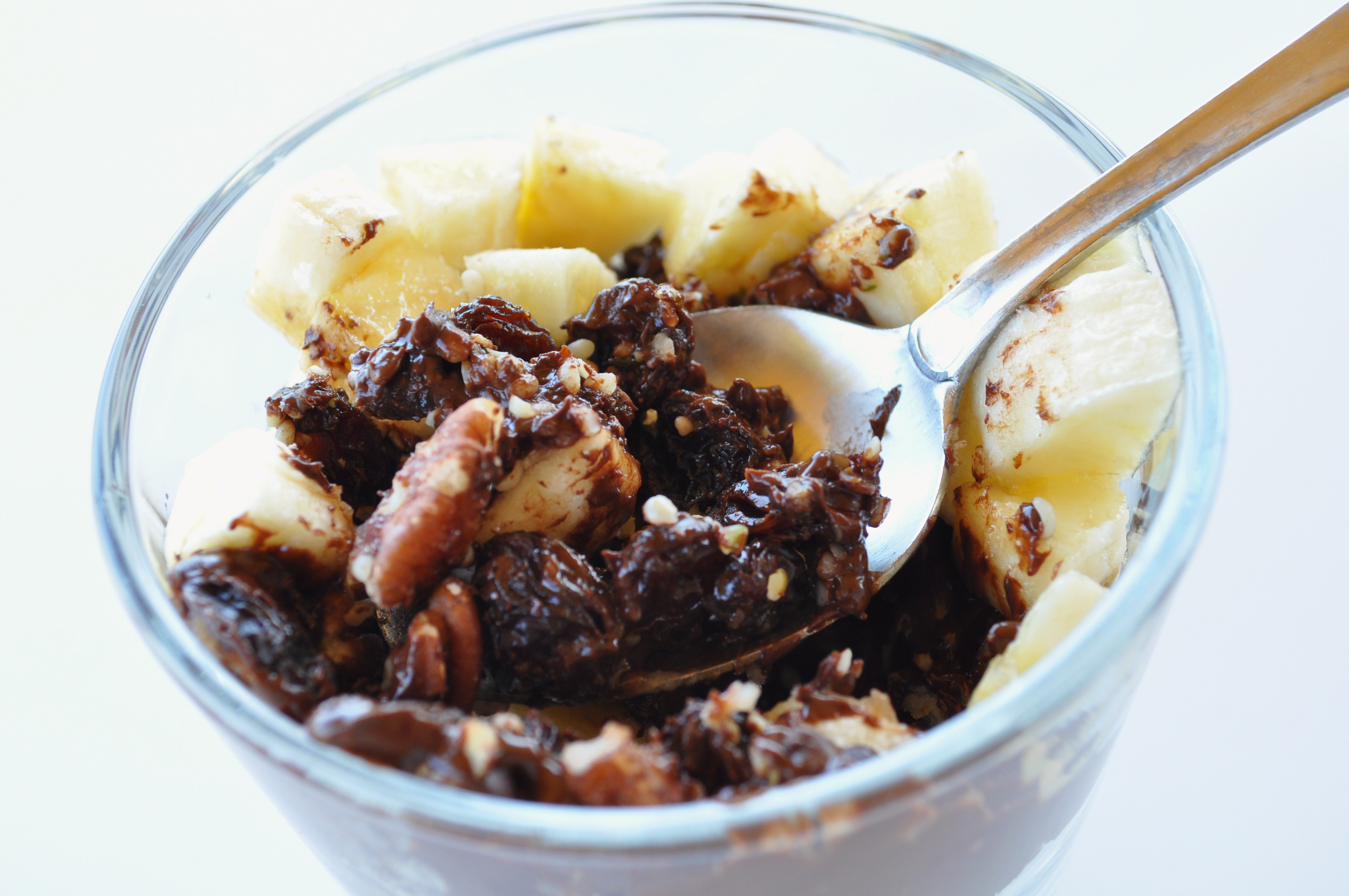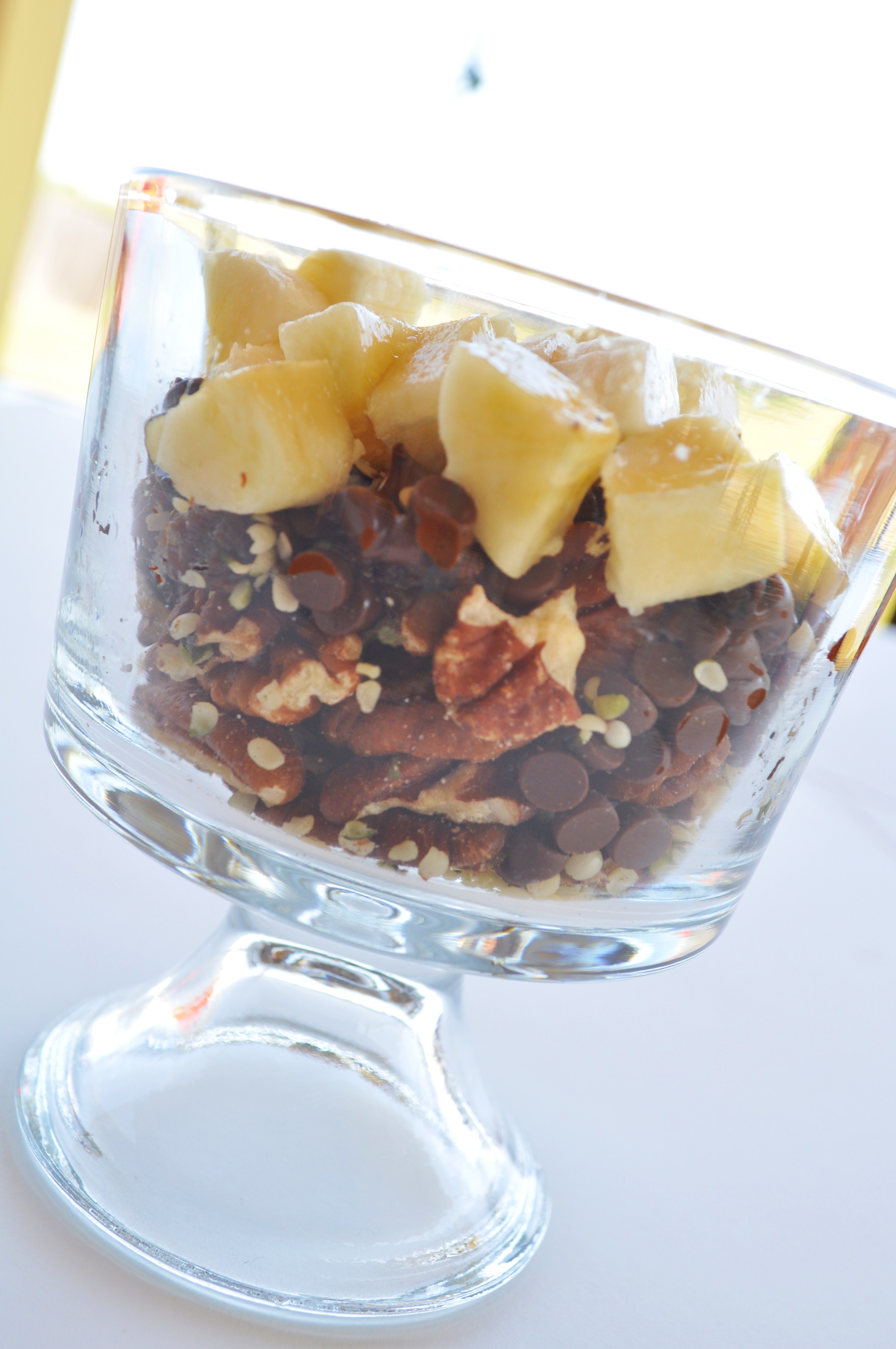 In a glass bowl or glass, layer nuts, dried fruit, seeds, and chocolate chips. Warm in microwave for 30 seconds or until chocolate just starts to melt. Don’t let chocolate burn. Top with bananas and/or yogurt. Enjoy.