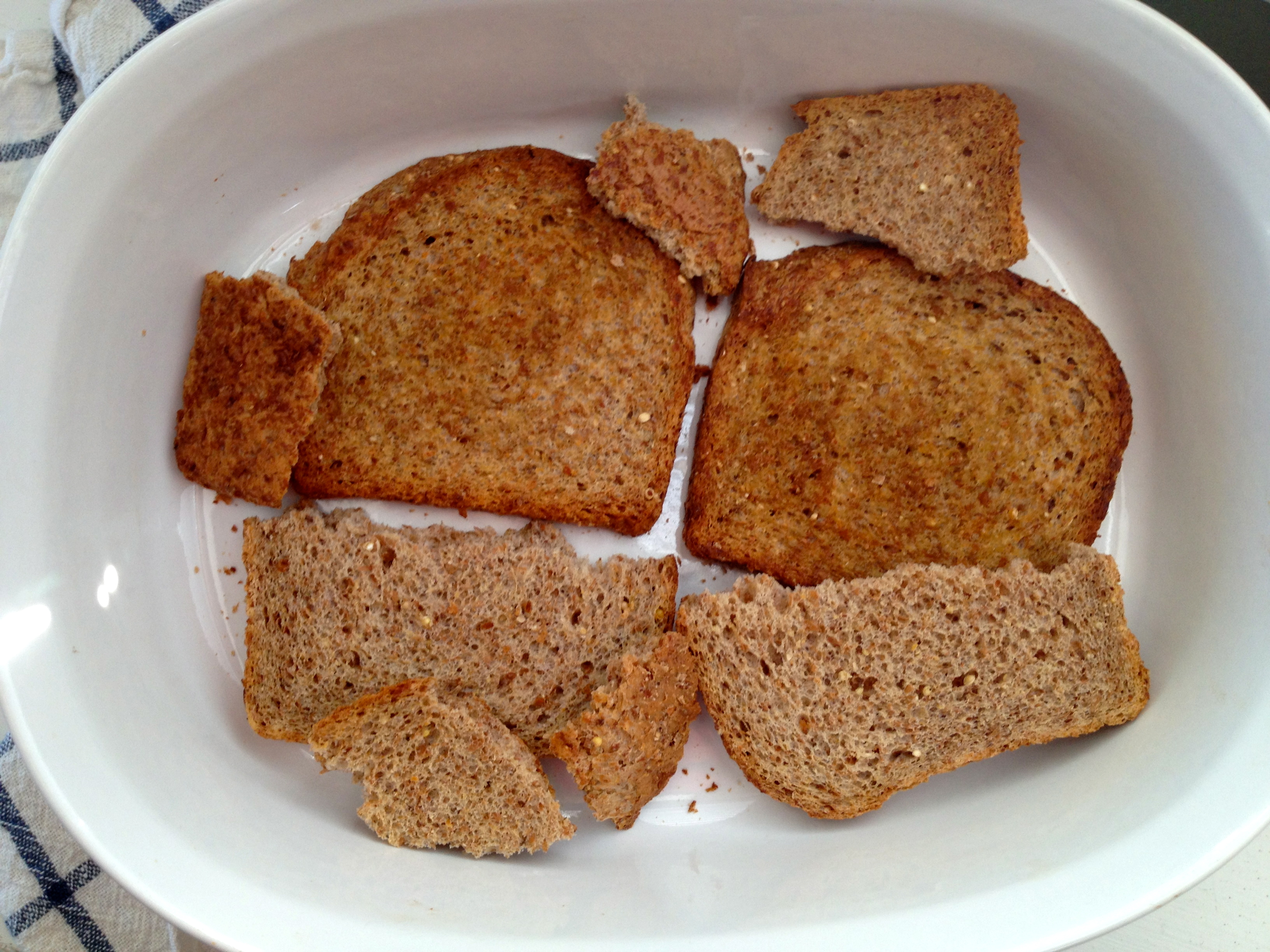 In a high-sided casserole dish, lay out four of your pieces of toast. Breaking them up as needed to fit. It doesn’t have to be perfect.