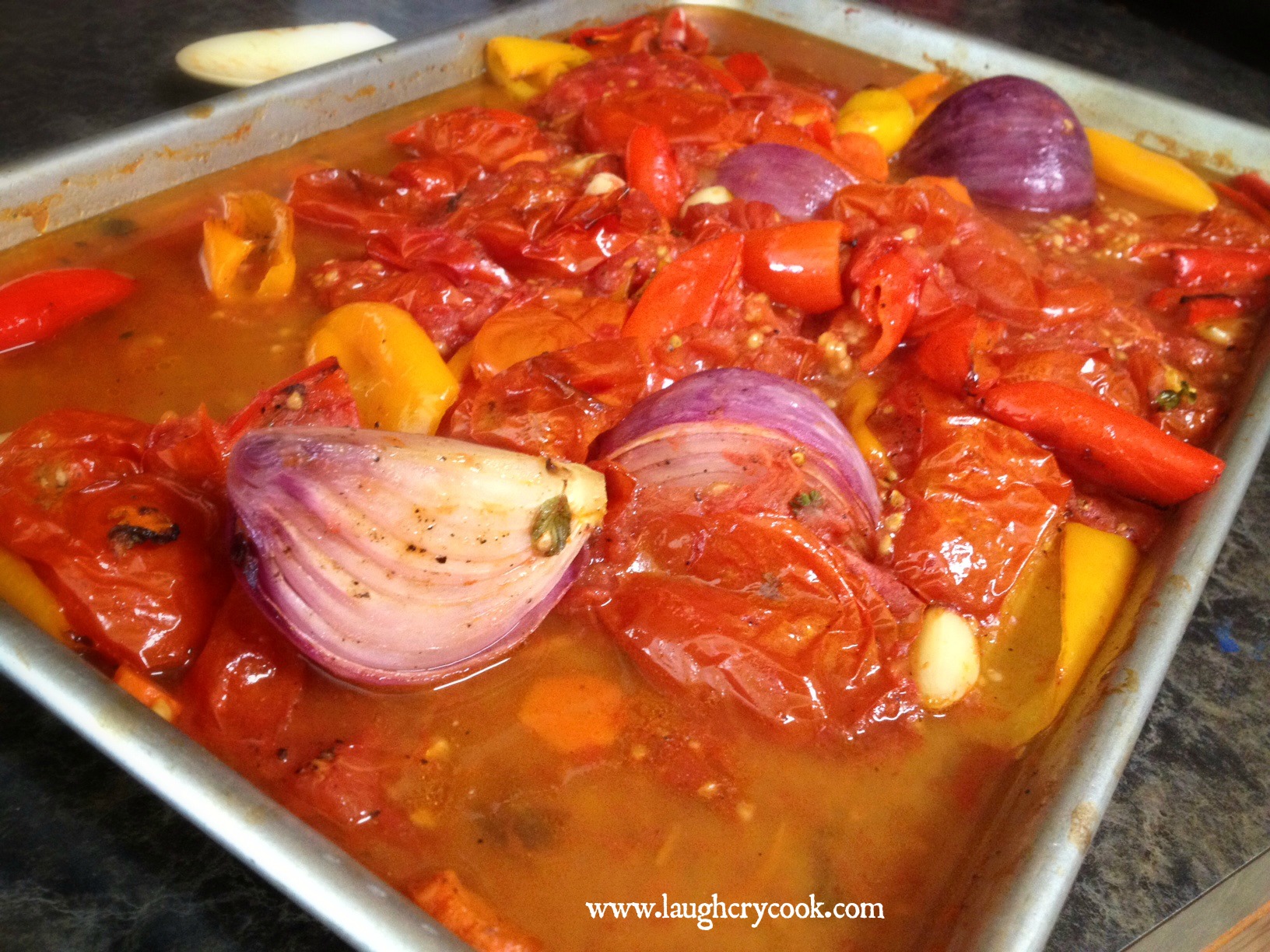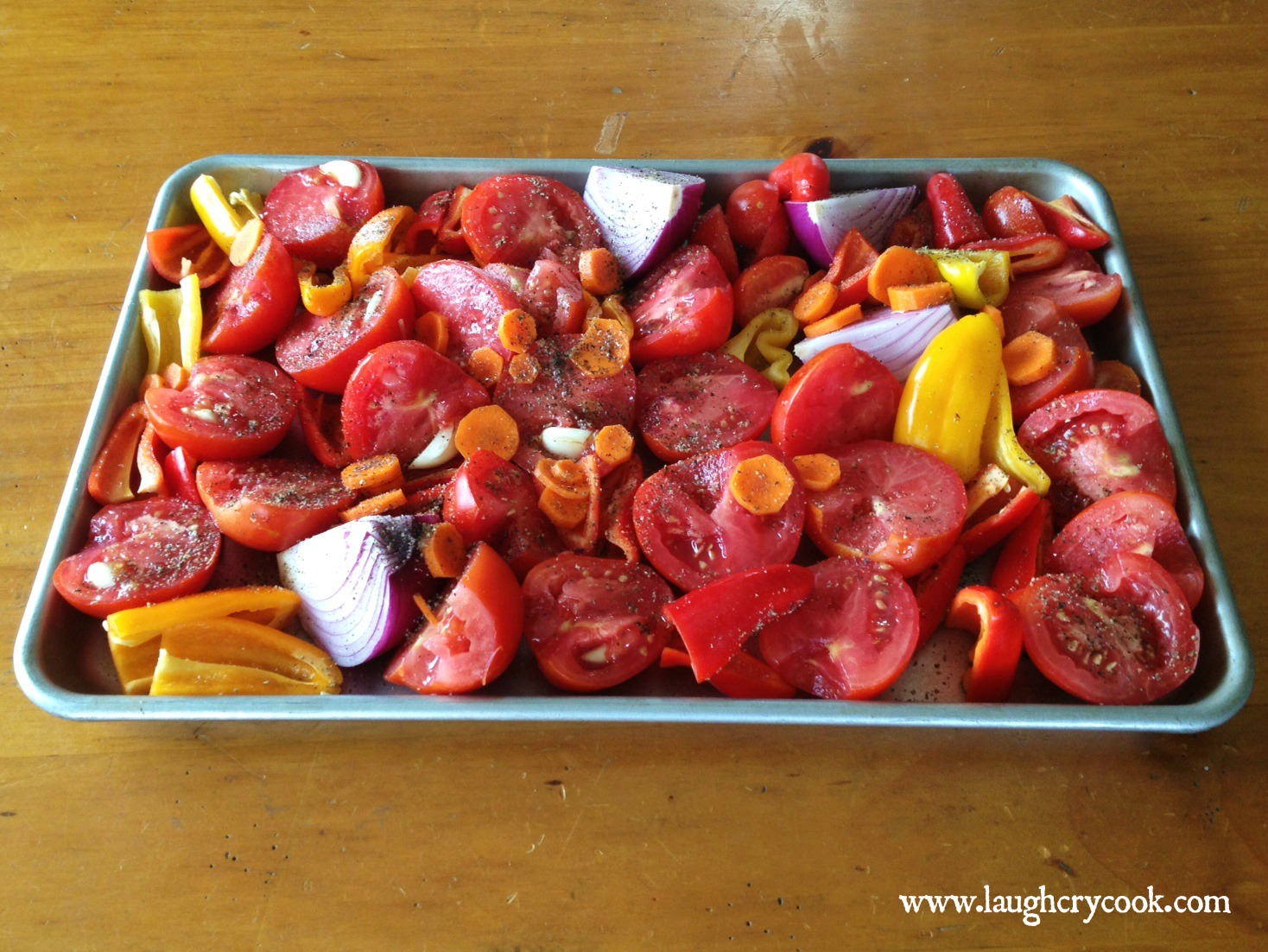 On a large baking sheet sprinkle olive oil and balsamic vinegar. Place chopped eggplant, red pepper and red onion on pan. Using clean hands mix the veggies with the oil and vinegar and then give the whole thing a light sprinkling of fresh sea salt and pepper. Put whole garlic cloves somewhere on pan either wrapped in foil or parchment with a little olive oil; or use a small clay garlic roaster.