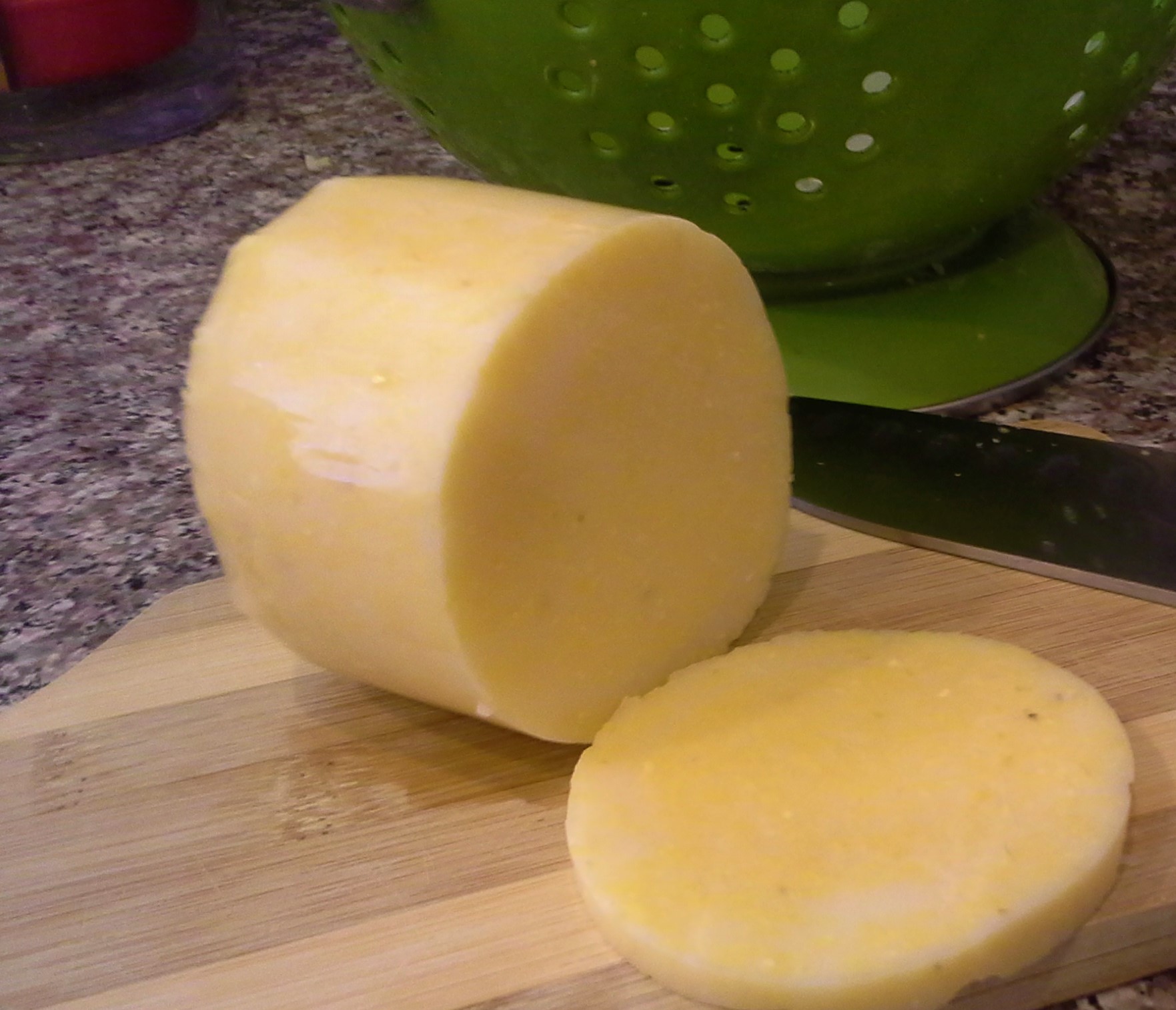 In another skillet (I like my iron skillet) let oil and butter melt and get hot while you slice the polenta into ¼ inch or so rounds. Place the rounds in the skillet and turn heat up to medium high so that the polenta starts to pan fry. When it is golden brown in places, turn it over and brown the other side. Sprinkle the tops very lightly with salt and pepper. Remove to a paper towel to drain any excess grease, then cover with another paper town to keep warm.