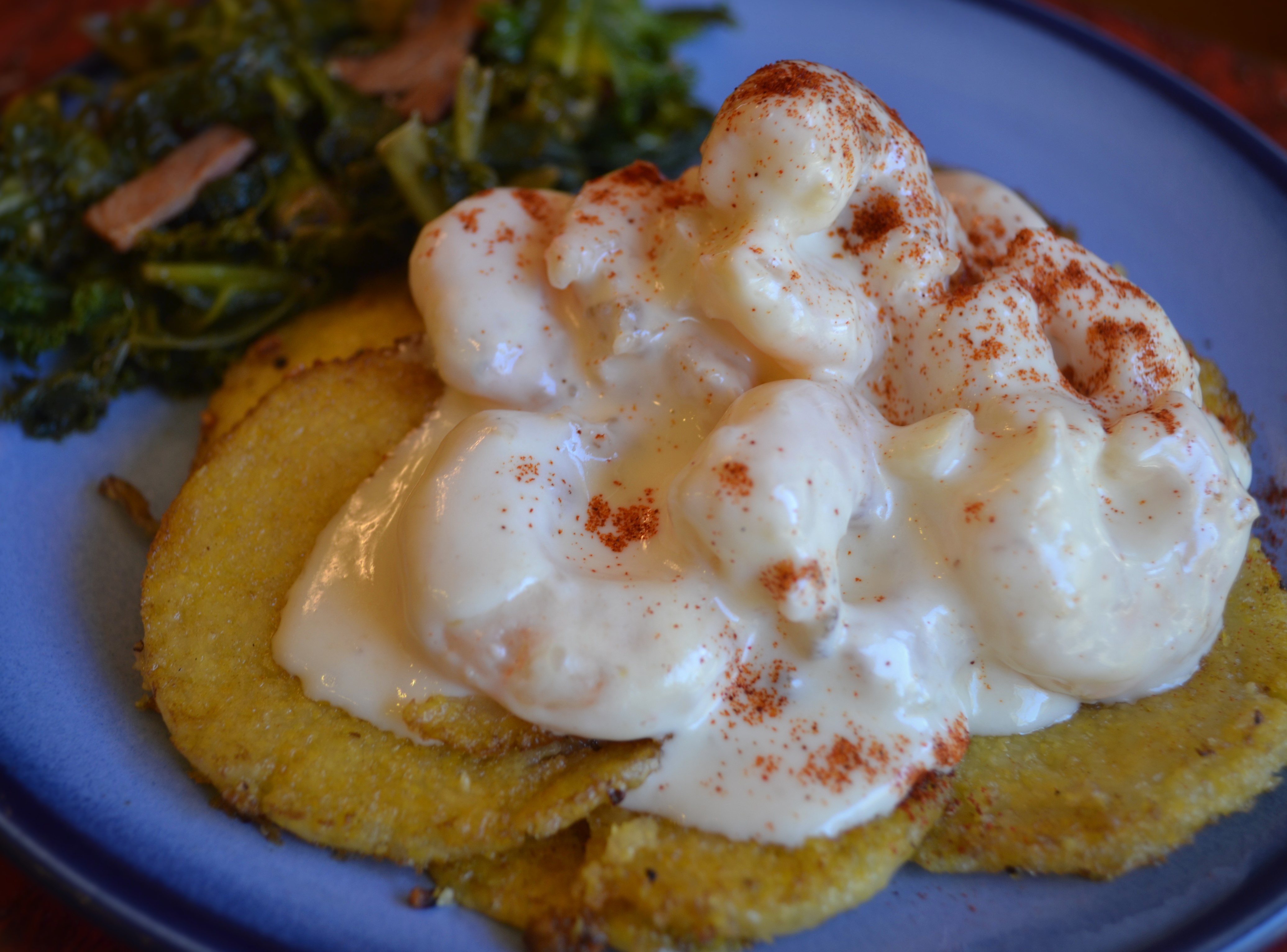Shrimp in Alfredo Sauce over Crispy Polenta with Greens