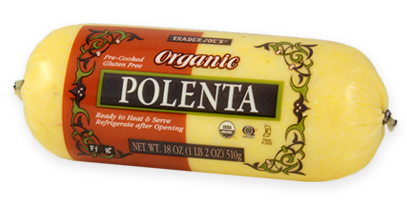 In place of the traditional grits, I pan-fried thin slices of ready-made polenta, often used in Italian recipes. I used Trader Joe’s brand, which comes in package shelf (not refrigerated), usually near the Italian section of the store. It looks like moist, cooked cornmeal made into a log and wrapped in plastic. That is because, well, it is. It is not the most appetizing looking food when you open it up for slicing. (Think yellow corn grits that may have been left too long in a pan.) However, once you’ve pan-fried them in olive oil and butter, with a little salt and pepper…. Look out, Louise. They turn into crispy-edged, buttery disks of corny decadence.