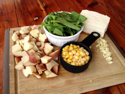I used potatoes, spinach, corn, and garlic, but you can easily modify this to whatever veggies or greens you have on hand — bell peppers, poblano peppers, onions, broccoli, carrots, summer squash, zucchini, kale, swiss chard, and collard greens would all be delicious.