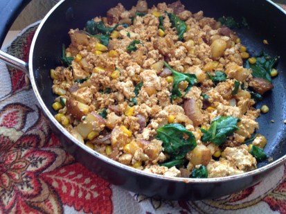 As soon as the garlic is translucent, crumble the tofu into the pan (just squish it up in your hands and break into little crumbles). Add smoked paprika, onion powder, pepper, and remaining salt. Return heat to medium and stir and cook for about five minutes. Add corn and cook until corn is heated through ( a few more minutes). Stir in the spinach and cook until just wilted.