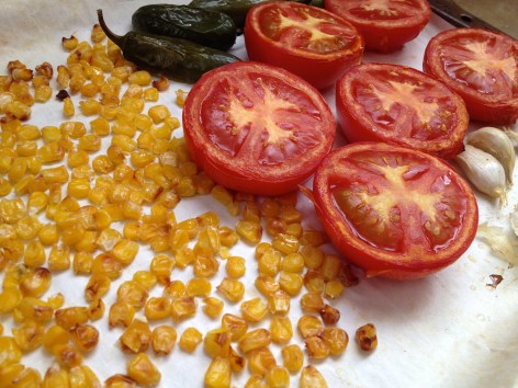 Heat oven to 400 degrees. Line a large baking pan with parchment paper. Pour corn kernels on one half of pan. On the other side, put the jalapenos, garlic (wrap unpeeled garlic in foil to prevent them from burning–not like shown below), and tomatoes sliced in half with cut side up. Use a pastry brush to put a small amount of olive oil on the tomatoes and corn. Sprinkle tomatoes with a touch of sea salt. Roast for 20 minutes.