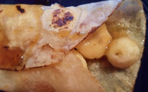 For banana sopapillas: slice one small banana and put in a skillet with a teaspoon of butter and a teaspoon of brown sugar. Stir just until bananas are warm and absorb butter and sugar. Proceed as above, only fill the tortilla with warm banana slices, roll like a burrito and serve with a little more honey. Eat with knife and fork. A dollop of ice cream and sprinkle of cinnamon couldn’t hurt either.