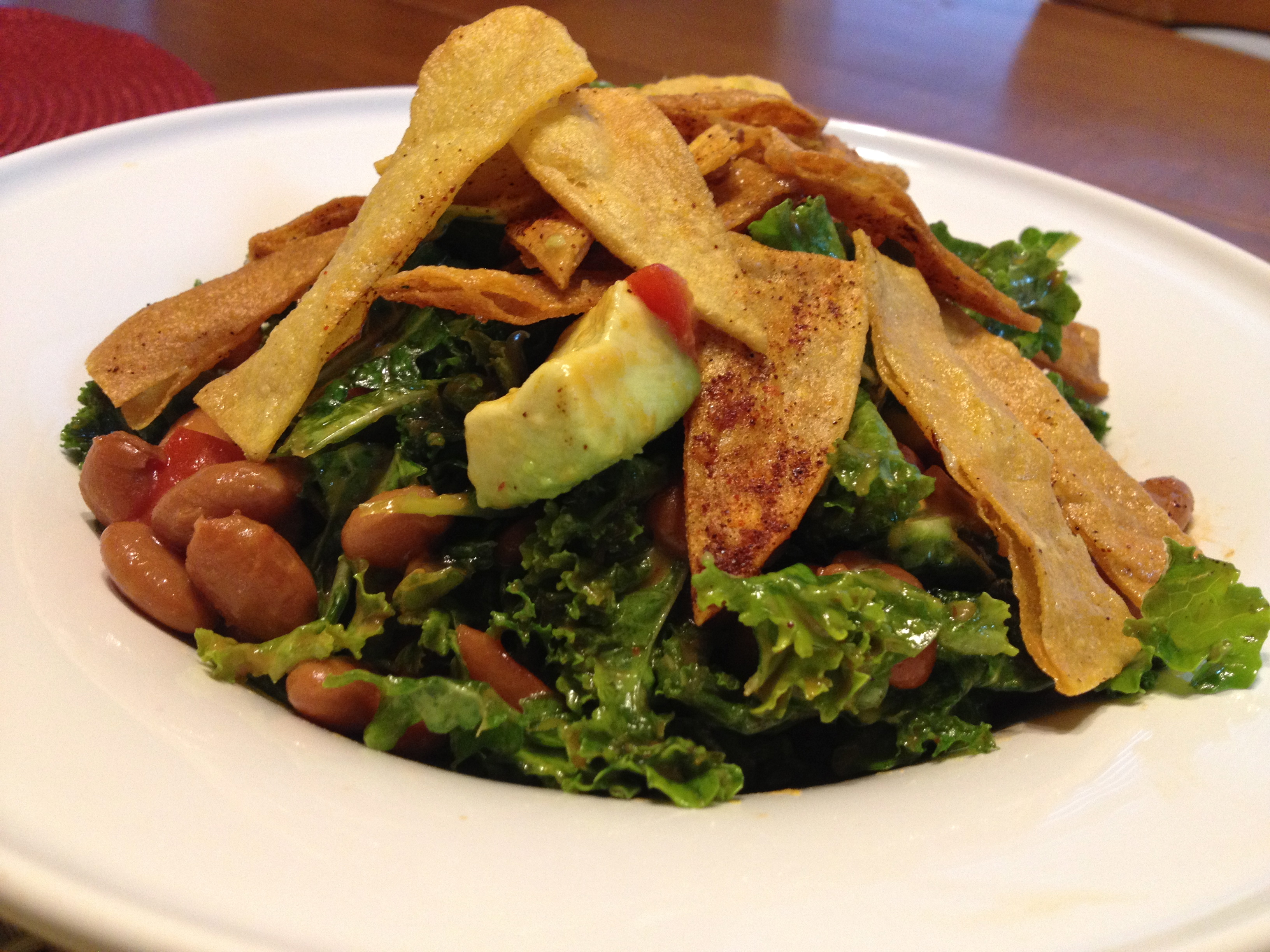Posted: December 20, 2012 Filed under: Main Dishes, Mexican Dishes, Salads, Sides, Uncategorized, Vegan, Vegetarian, Veggies | Tags: chipotle honey dressing, fried tortilla chips, kale mexican salad, mexican salad, vegan entree salad Leave a commentWhen I was a kid, a staple quick dinner in our house was Mexican Salad. You know, chopped ice berg or romaine lettuce, Ranch Style Beans, tomatoes, shredded cheese, catalina dressing, all topped off with a bag of fritos. Adding fritos to lettuce is a sure fire way to get kids to eat their greens.