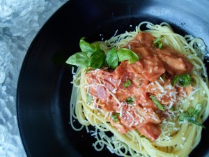 This easy vodka pasta sauce turned out creamy and delicious with lots of flavor layers going on, from the thin salty pieces of Italian salami to the nice bite of the tomatoes and artichokes, to the smoothness of the melted cheese. I learned to make a simple pasta sauce from a New York-Italian friend of mine: it was just lots of fresh grated garlic, a few chopped fresh tomatoes, and about ½ cup of creamy cheese, like a brie or soft Buffalo mozzarella or even cream or goat cheese (or a combination). You simply melt it all together over low heat, and pour over pasta. This sauce springs from that basic idea, but I’ve fancied it up a bit.