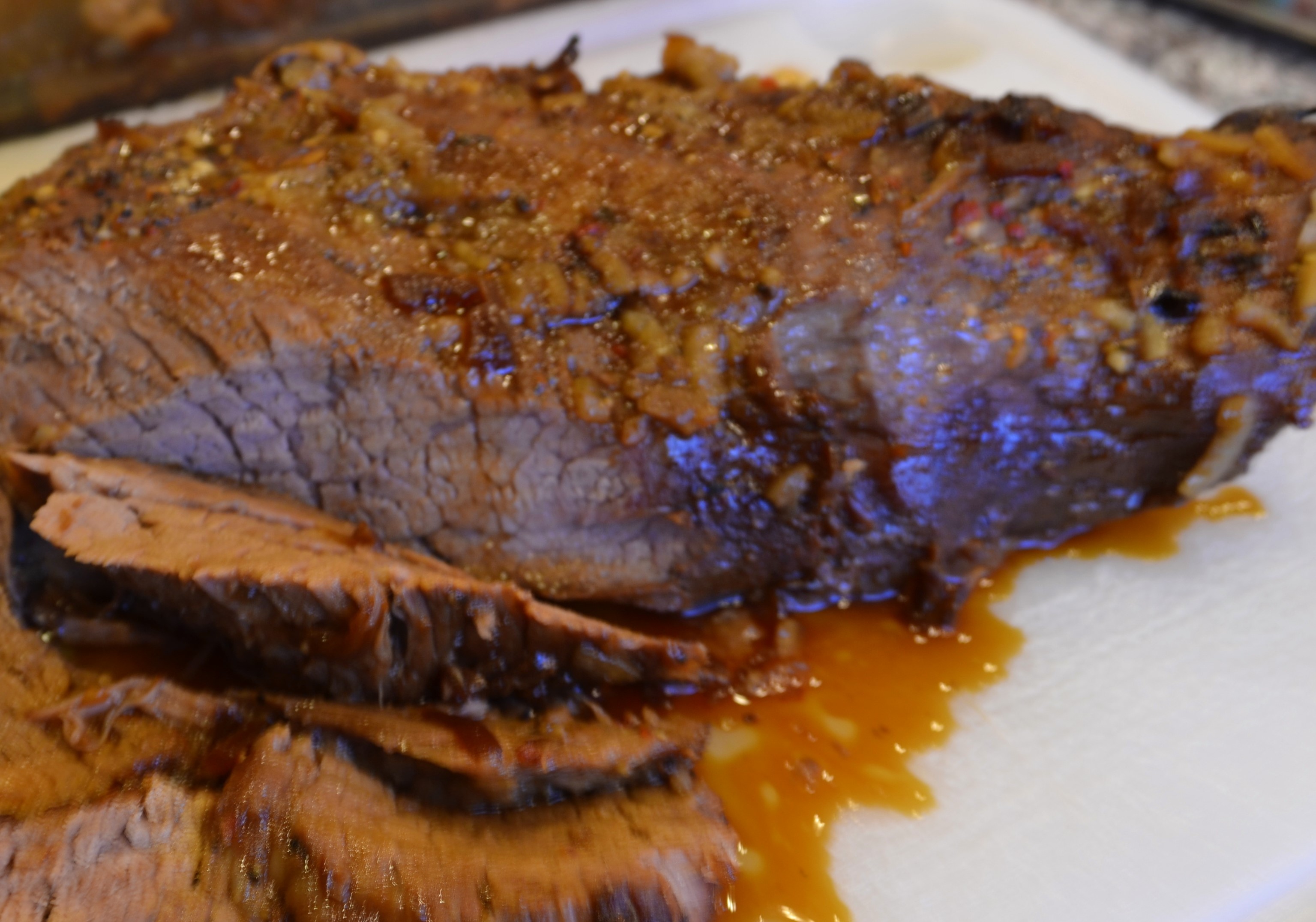 When the tri-tip is done, carefully cut a slit in the bag and pour the juices into your biggest, deepest skillet. Slice the roast (I use an electric knife) across the grain. Then put the slices into the au jus in the skillet and simmer for a few minutes to infuse the roast with juices. Test to see if it needs additional salt and pepper.