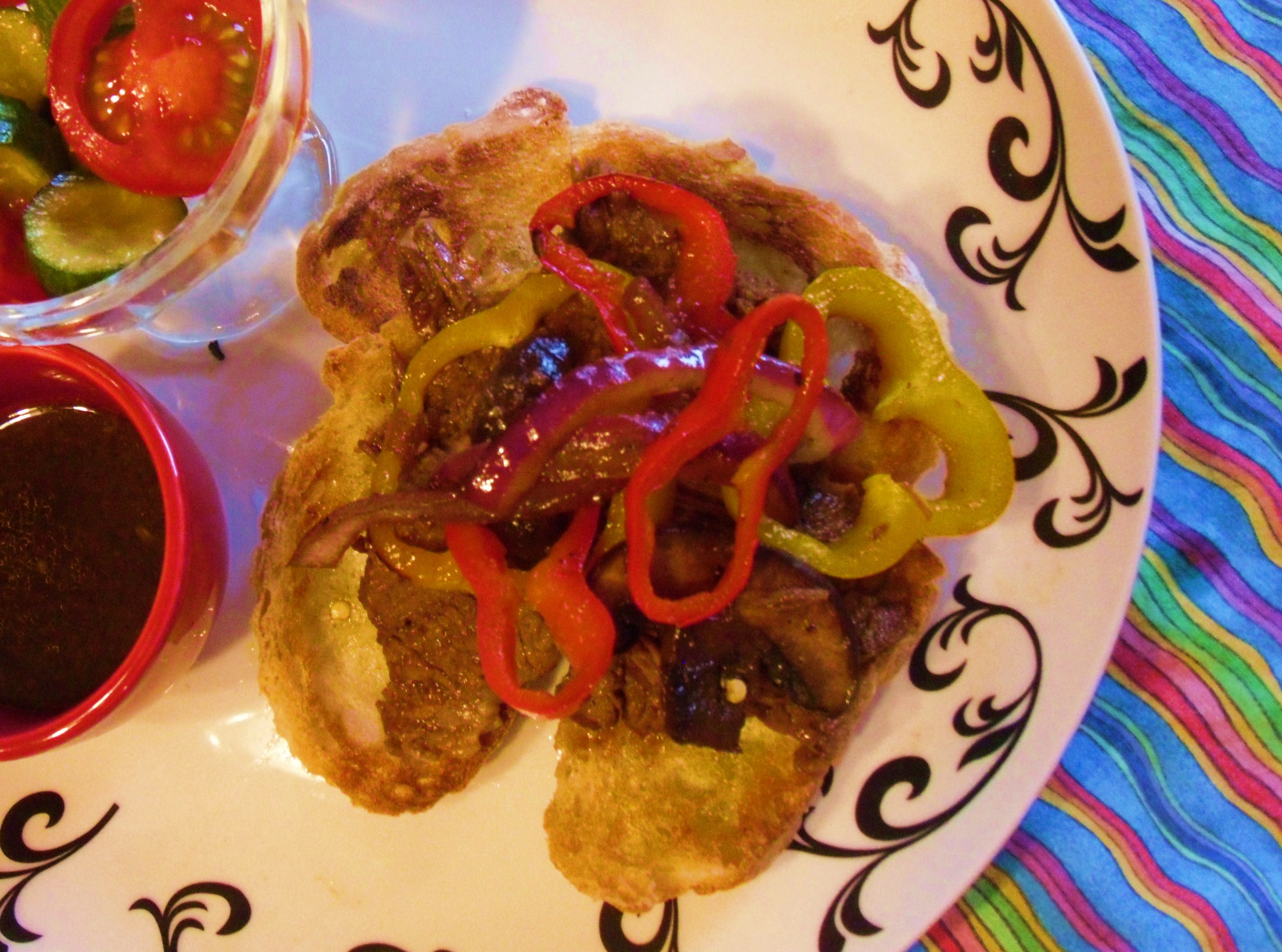 I serve this roast alongside mashed potatoes and a salad the first day. But the second day is my favorite, because the I take the thinly sliced marinated leftovers and put them atop thick slices of buttery garlic toast, then top this with grilled onions and peppers, and finally the au jus. Au man, it is amazing.