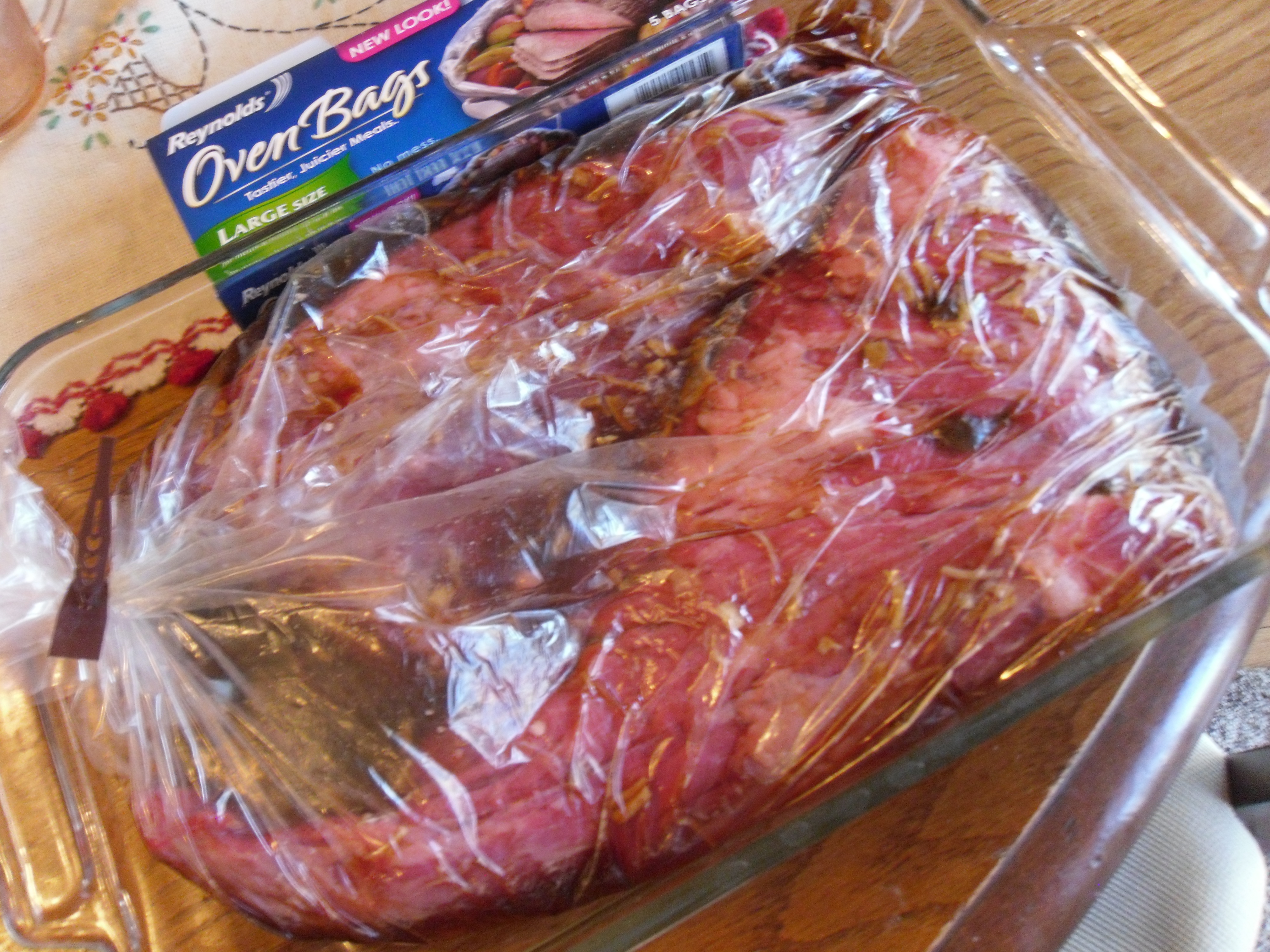 Take a large cooking bag and holding it upright like you would a grocery bag, fill it with teriyaki sauce, onion soup mix and warm water. Carefully squish it around. Then, put both tri tips in the bag (you may want to call for some help on this), tie the bag with the twist tie that comes in the package. Then carefully lay the tri tips into a large rectangle pan. I do not poke holes in the cooking bag, and this seems to keep the roast juicier.