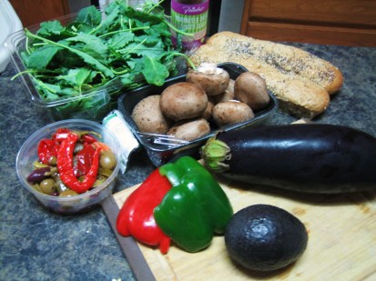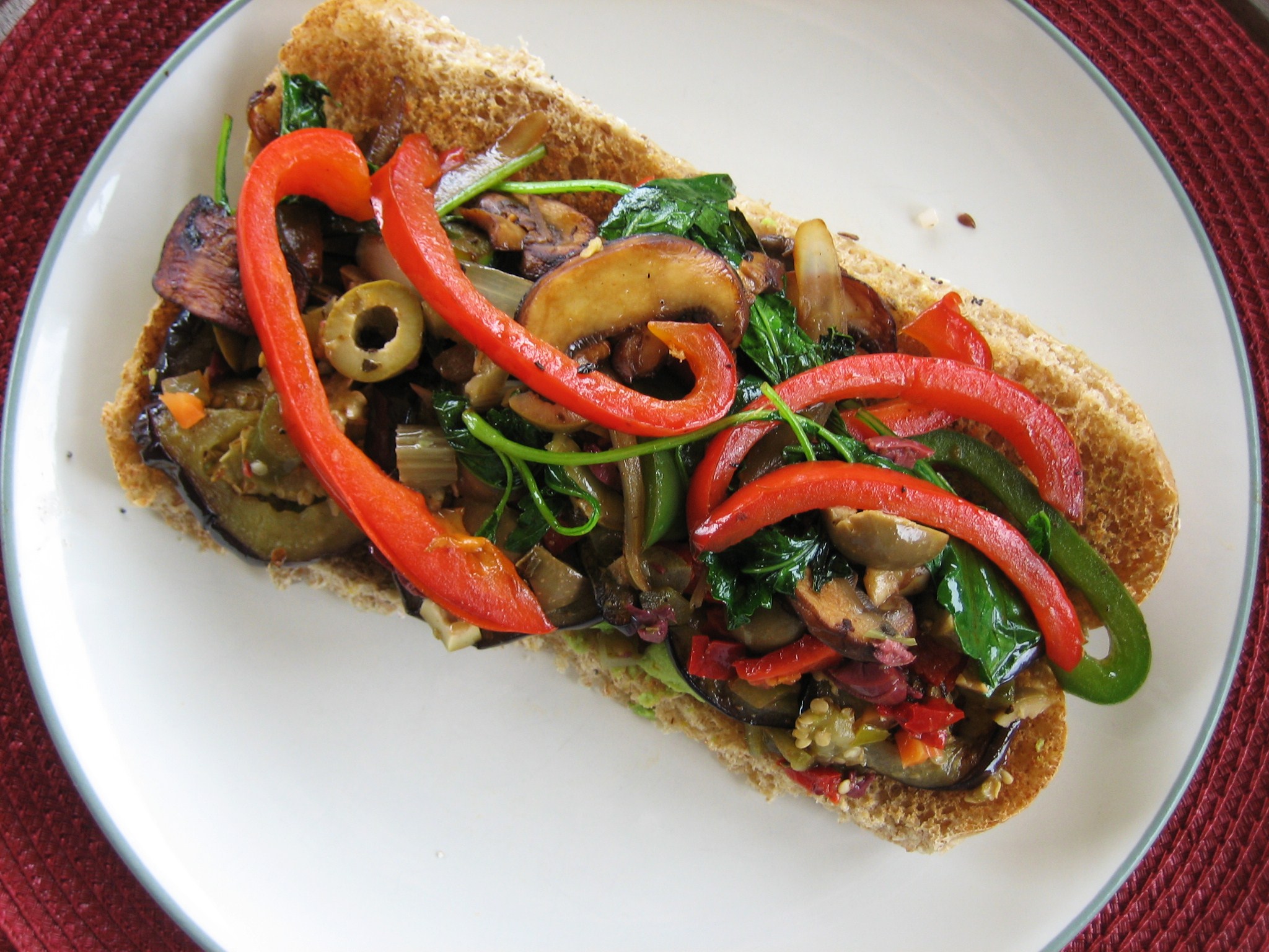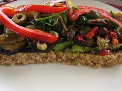 Now pile on the ingredients: avocado slices, eggplant, onions, peppers, mushrooms, greens, sundried tomatoes and the spicy olive & pepper mix. You might want to tackle these with a knife and fork, or if you’re brave and don’t mind a mess just pick it up with both hands and go for it. As the old saying goes, Eat Like Nobody’s Watching (or something like that!)