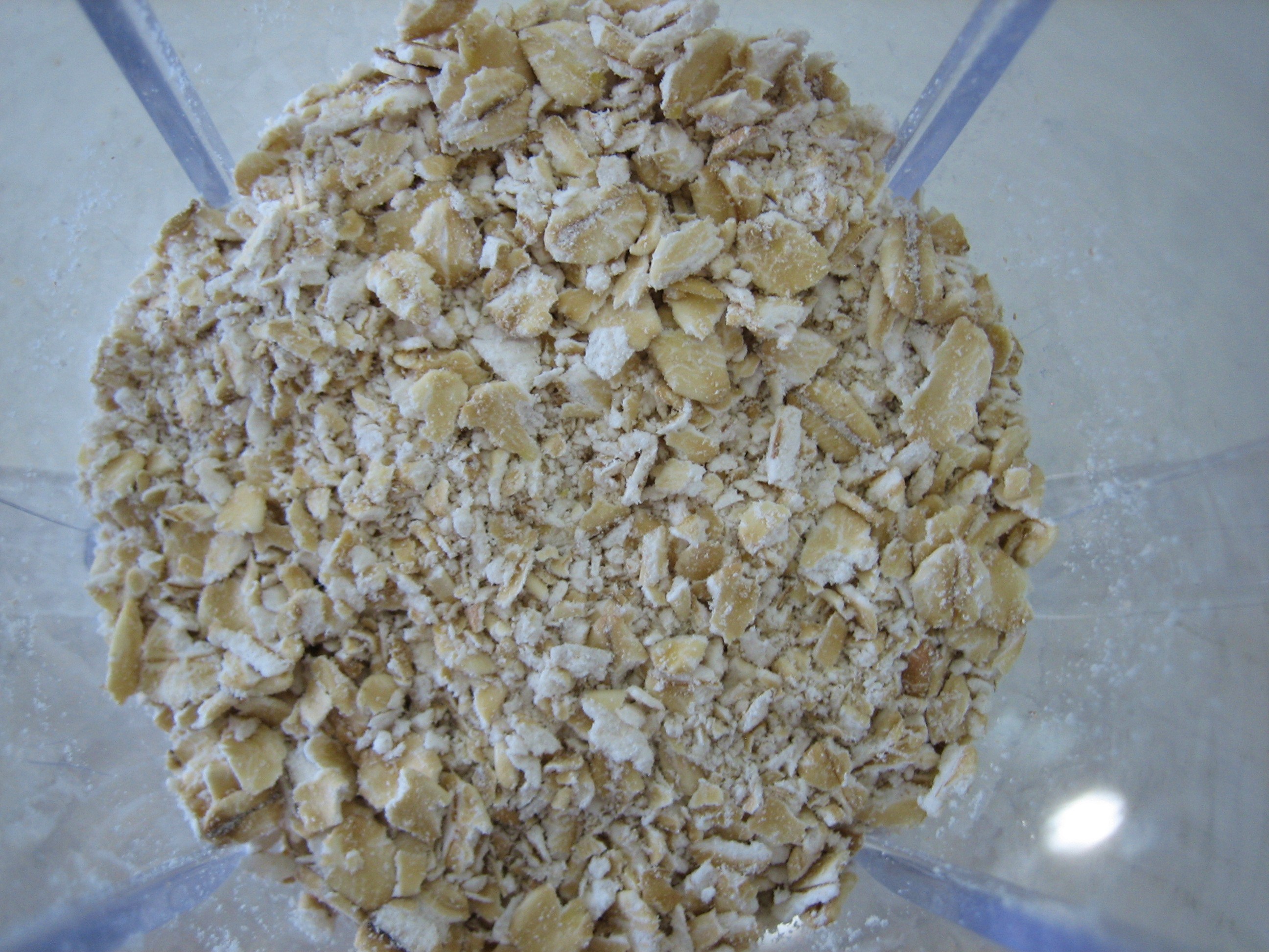 Pulse oats in a blender, food processor, or coffee bean grinder once or twice until they are coarsely ground like this.