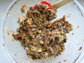 In a large bowl, mash one can of drained black beans (a fork, potato masher, or your hands will do the job), then add the other can of drained black beans and just lightly mash them, leaving some whole. Add the sauteed veggies and all the other ingredients, except for 1/2 of the bread crumbs, and mix well, mashing some of the sweet potatoes to help bind the mixture.