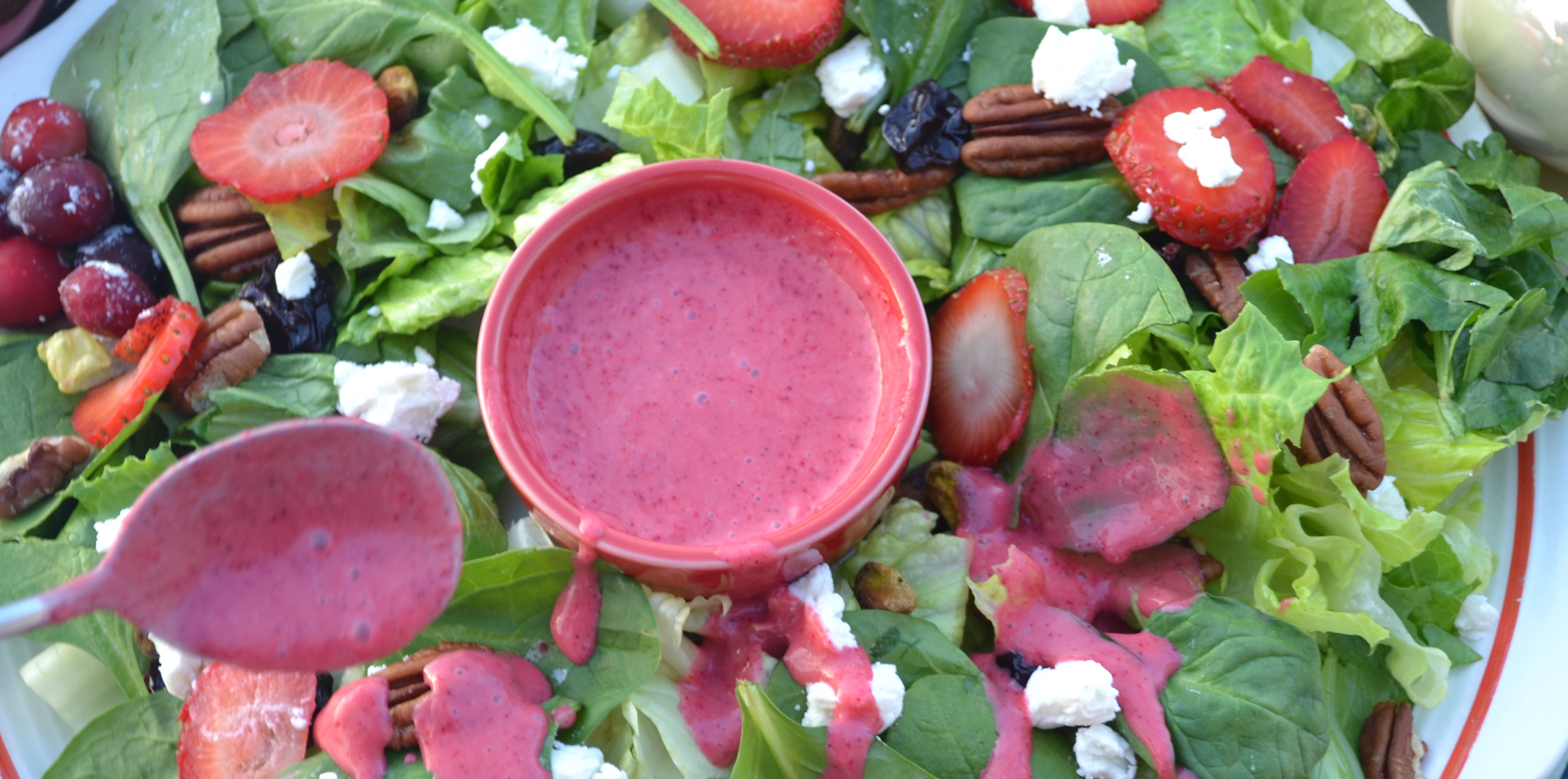 On a large round plate, put a small bowl for the salad dressing in the middle. Arrange salad greens around the bowl to make a “wreath”, then dot the wreath with nuts, dried berries and fresh betters. Finally sprinkle with feta “snow”. Fill the bowl in the middle with the following vinaigrette and serve chilled.