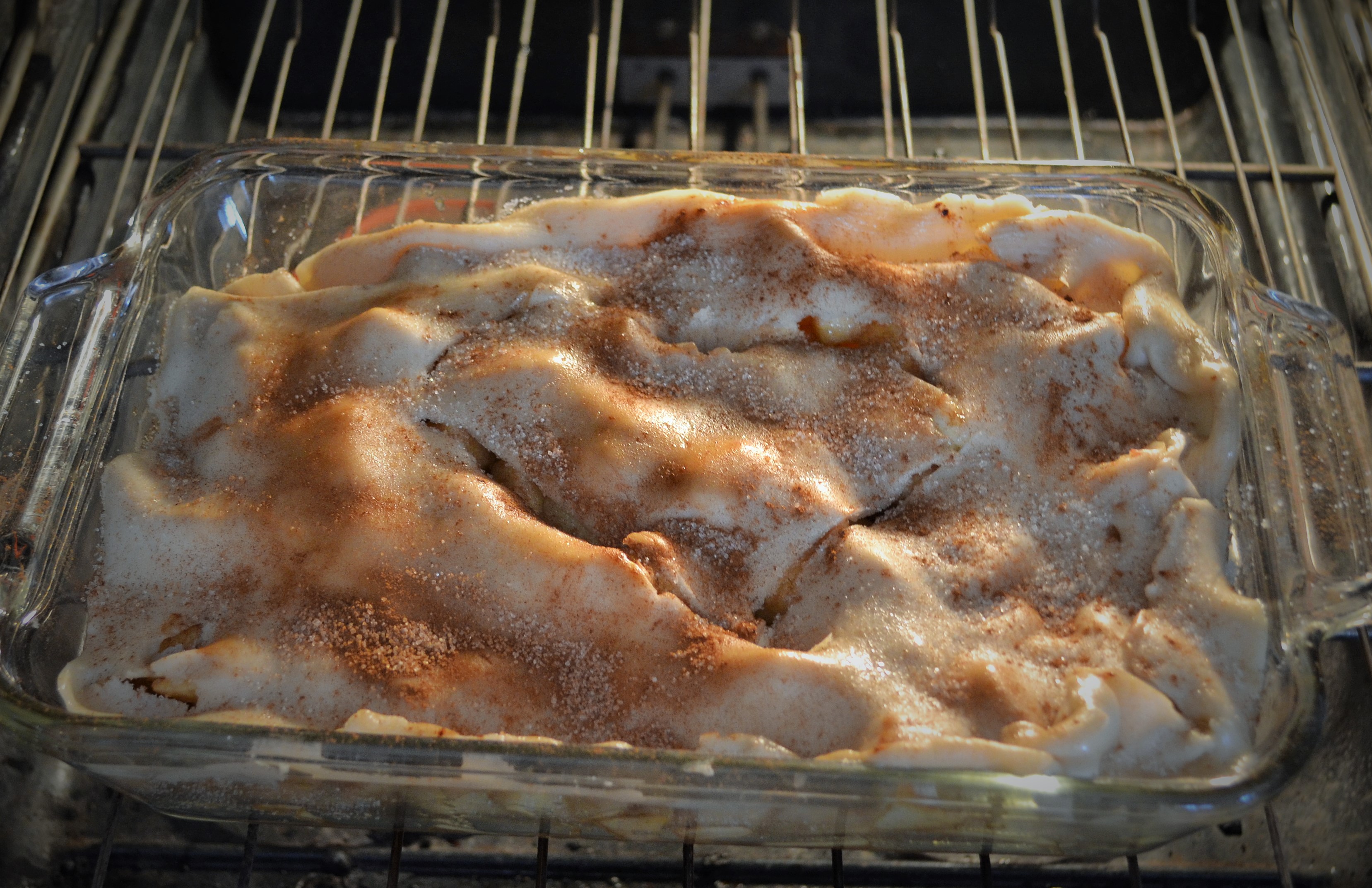In a large mixing bowl put apples, brown and white sugars, flour, spices and salt. Mix thoroughly. Butter a 9 by 11 casserole pan and pour the apple mixture into it. Squeeze a fresh lemon over the top of the apples and then dot with butter. Place one Pillsbury refrigerated pie crust on top of the apples, tearing it and patching it (pinch pieces together) to create a rustic, “quilted-together” pastry crust as shown below. Sprinkle with cinnamon and sugar. Note that you just kind of loosely fold the edges and tuck them around the apples. I also cut a heart shape in the middle, though as you can see, I am not a pastry artist. No worries about it looking messy, it will come out delicious and beautiful.