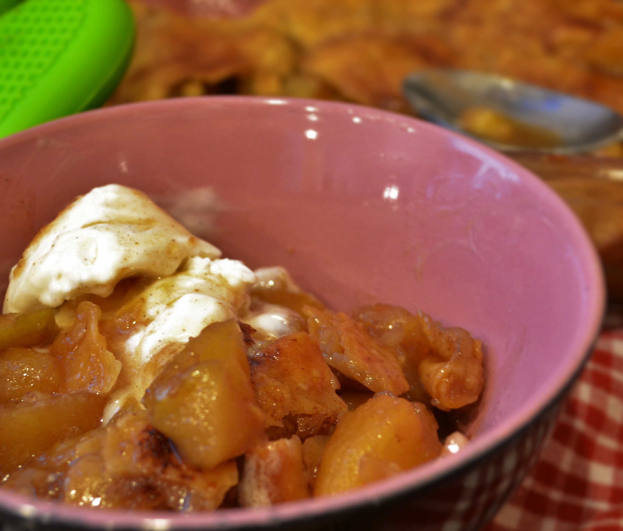 Bake for about 30 to 40 minutes or until crust is golden and flaky and apples pierce easily with a fork and the juices are golden brown and syrupy. Serve warm, using a big spoon to place in bowls, and top with ice cream.