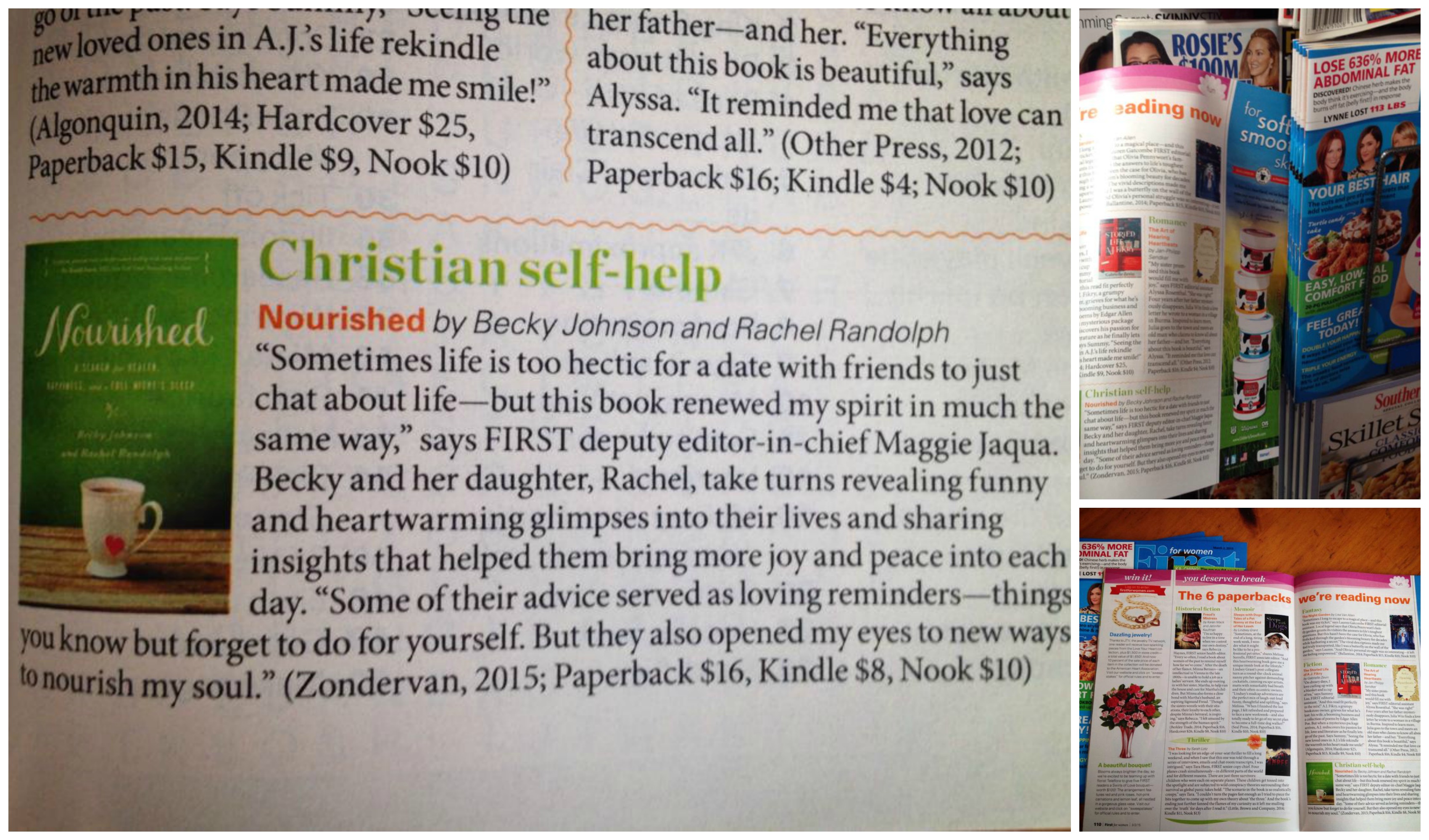 Finally, a little bit of fun news from “First Magazine for Women” (you will often see this at grocery check-out counters). Last week the editor of the magazine gave a lovely review for our book, Nourished. Here’s a picture of the article: