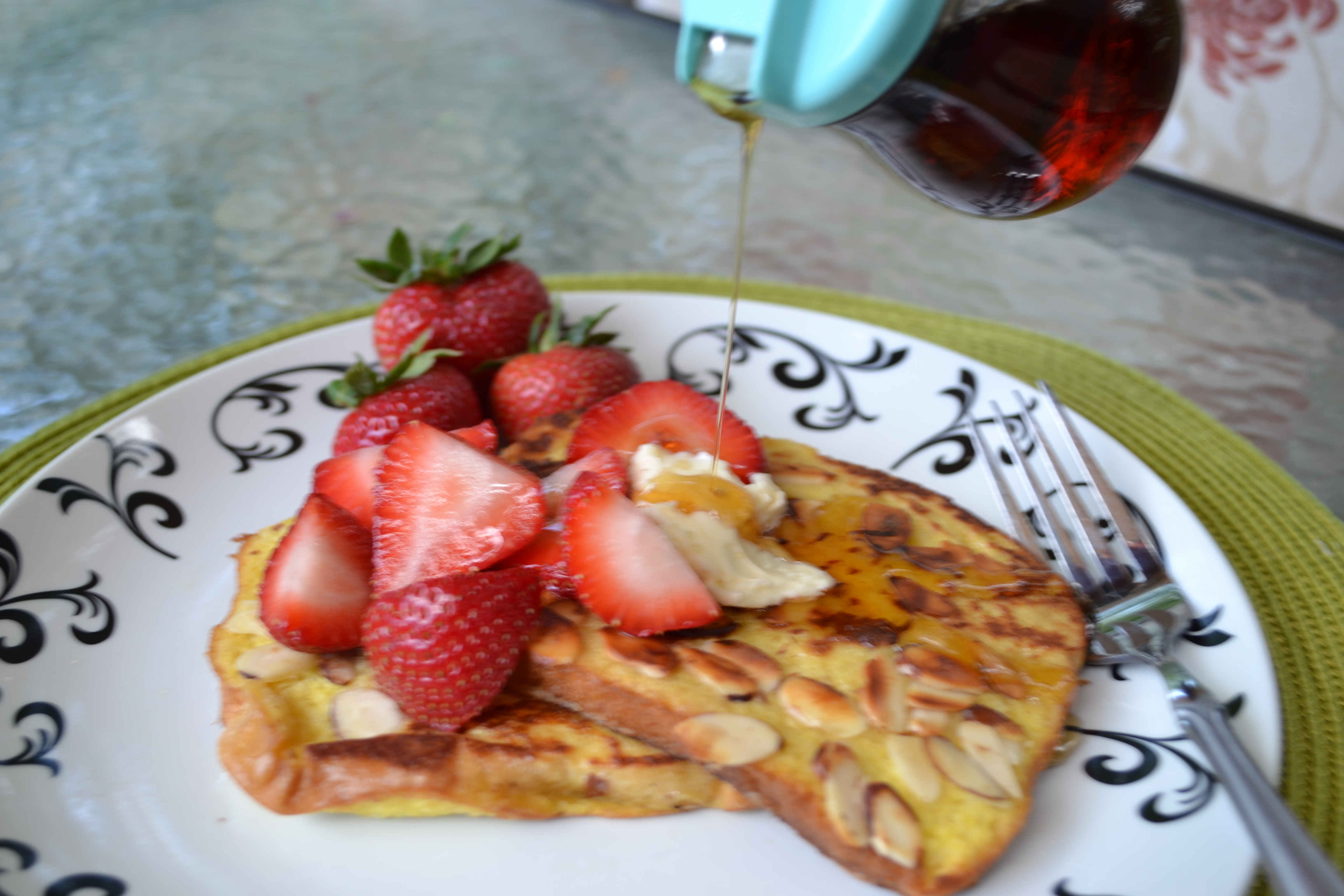 I love French Toast, but when the bread has not only been dipped in egg (flavored with Amaretto) but also coated with a thin layer of sliced almonds before being grilled in butter… well, as my husband Greg said, “That’s the best French toast I’ve ever had in my life.” Top these crunchy, almondy French toast with butter, fresh sliced strawberries, real maple syrup and serve with a side of sizzling bacon or sausage and your day (whether it’s morning or evening) will take a sharp and instant turn for the cheerier. And vegans, do not worry! There’s a terrific vegan alternative for this recipe at the end of the post.