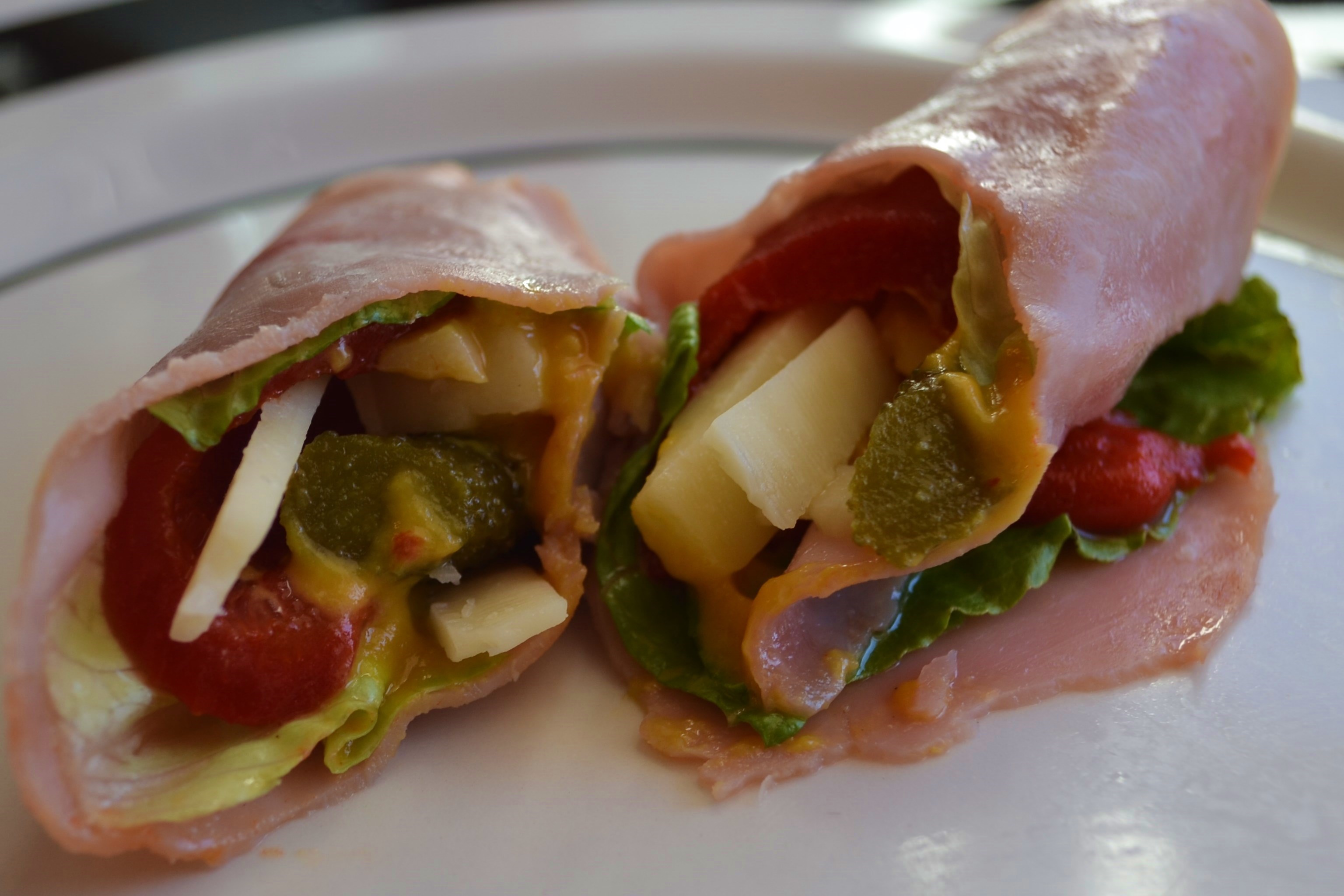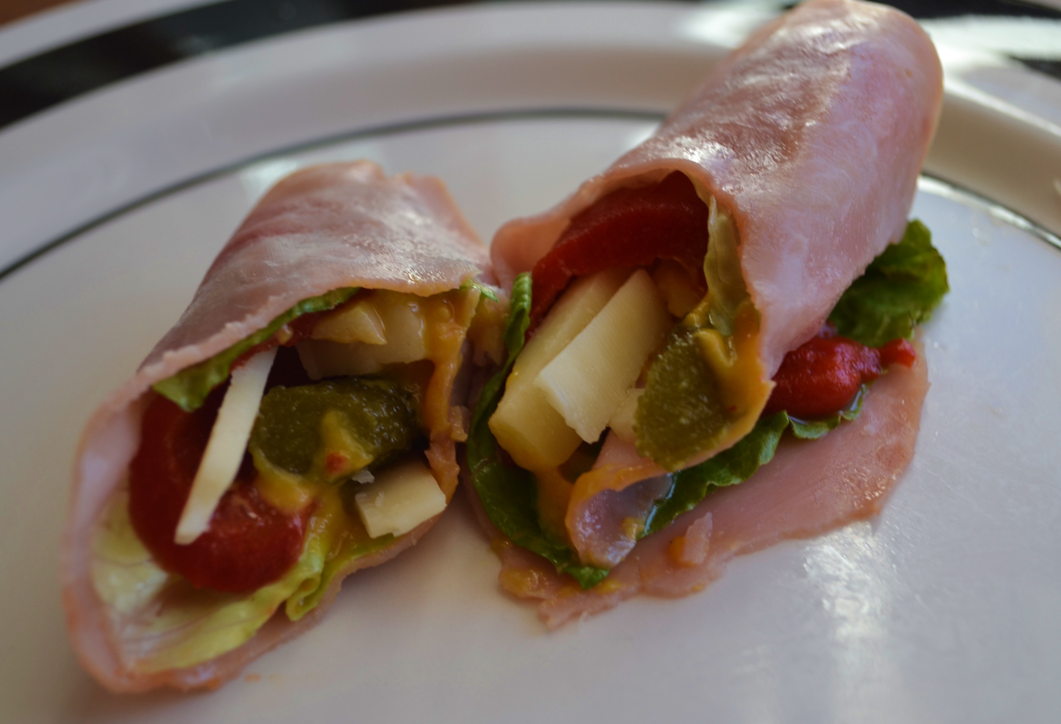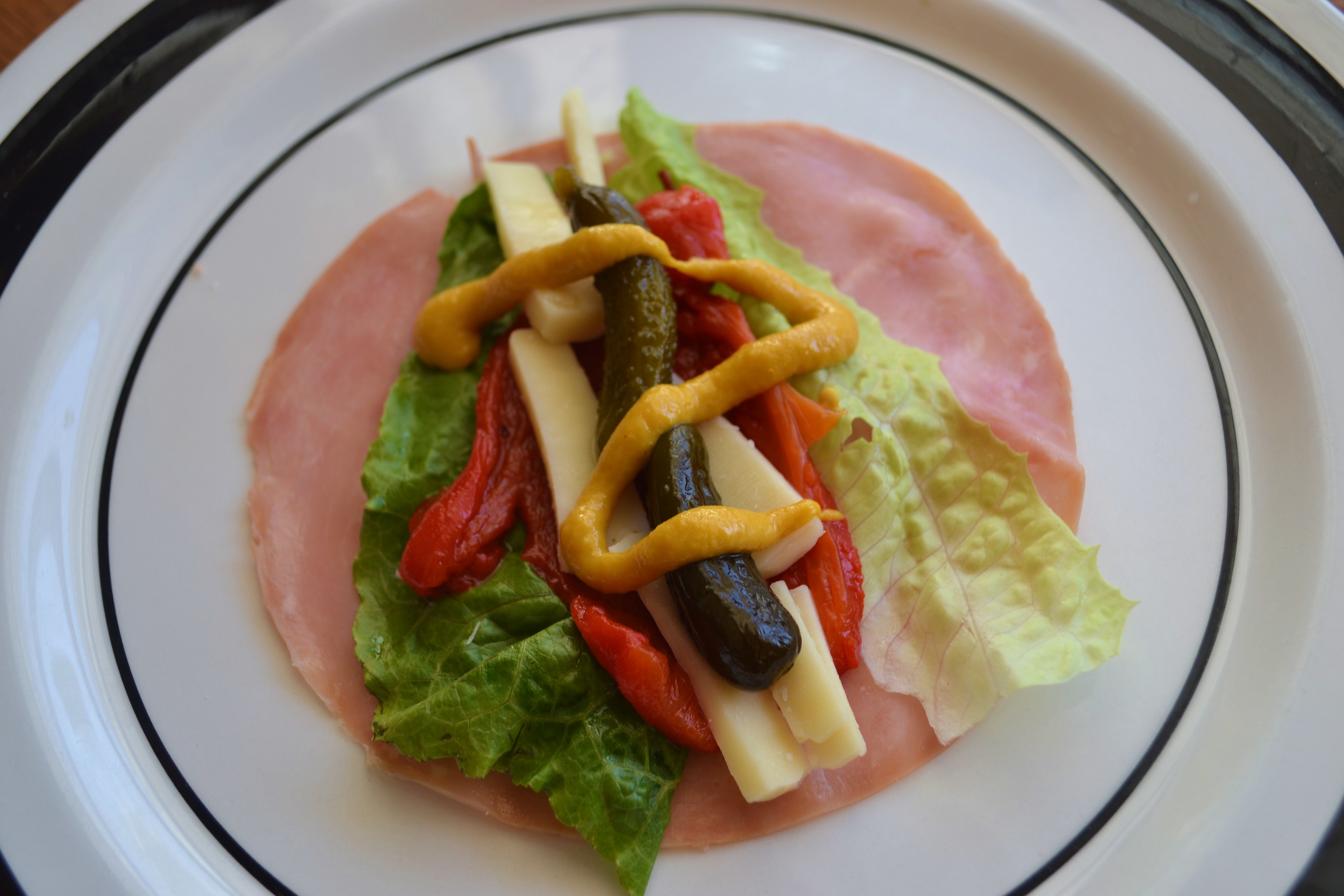 I used thin deli Honey Ham, a slice of Romaine, a slice of Roasted Red Pepper, some white cheddar cheese strips, sweet pickles and honey mustard. Yummmm….