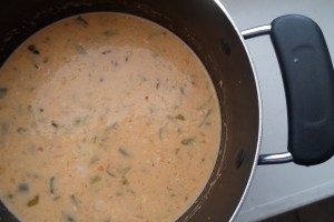 Cook corn and once it is cool to touch, cut kernels it off the cob (4 large ears yielded about 3 cups for me). Rub the knife along the cob to capture any “corn milk” juices that you can as well. Dice the roasted peppers. Melt oil and butter in large deep skillet or soup pan. Saute onions and garlic, add spices, corn and peppers. Let simmer over medium high heat until hot and fragrant, about 3 minutes.