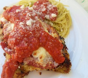 Vegetarian or Vegan Variation: Use a vegan chicken patty (such as Gardien brand frozen chick’n scallopini), tofu, tempeh or seitan instead of chicken breasts. Use or make a vegan pesto (omit the parm cheese in most pesto recipes). The cooking time in the oven following pan-frying may not be needed at all, or just cook for a few minutes with tomato sauce and cheese. Vegans can serve without cheese, or use vegan versions of mozzarella and Parm on top.