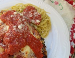 Before serving ladle each breast with more marinara and sprinkle with more Parmesan cheese. This dish is excellent served with a side of angel hair pasta that has been tossed in a little pesto.