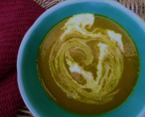 It is fun to serve this soup and watch the expressions from guests. They always ask for seconds, and then, for the recipe. Even people who don’t like peppers (like my husband) love it. It is smooth and slightly sweet (thanks to the addition of a sweet potato and bit of maple syrup), mingled with the crisp fresh taste of yellow peppers. When you swirl in a tablespoon of rich heavy cream, it adds a buttery richness and makes a beautiful presentation.