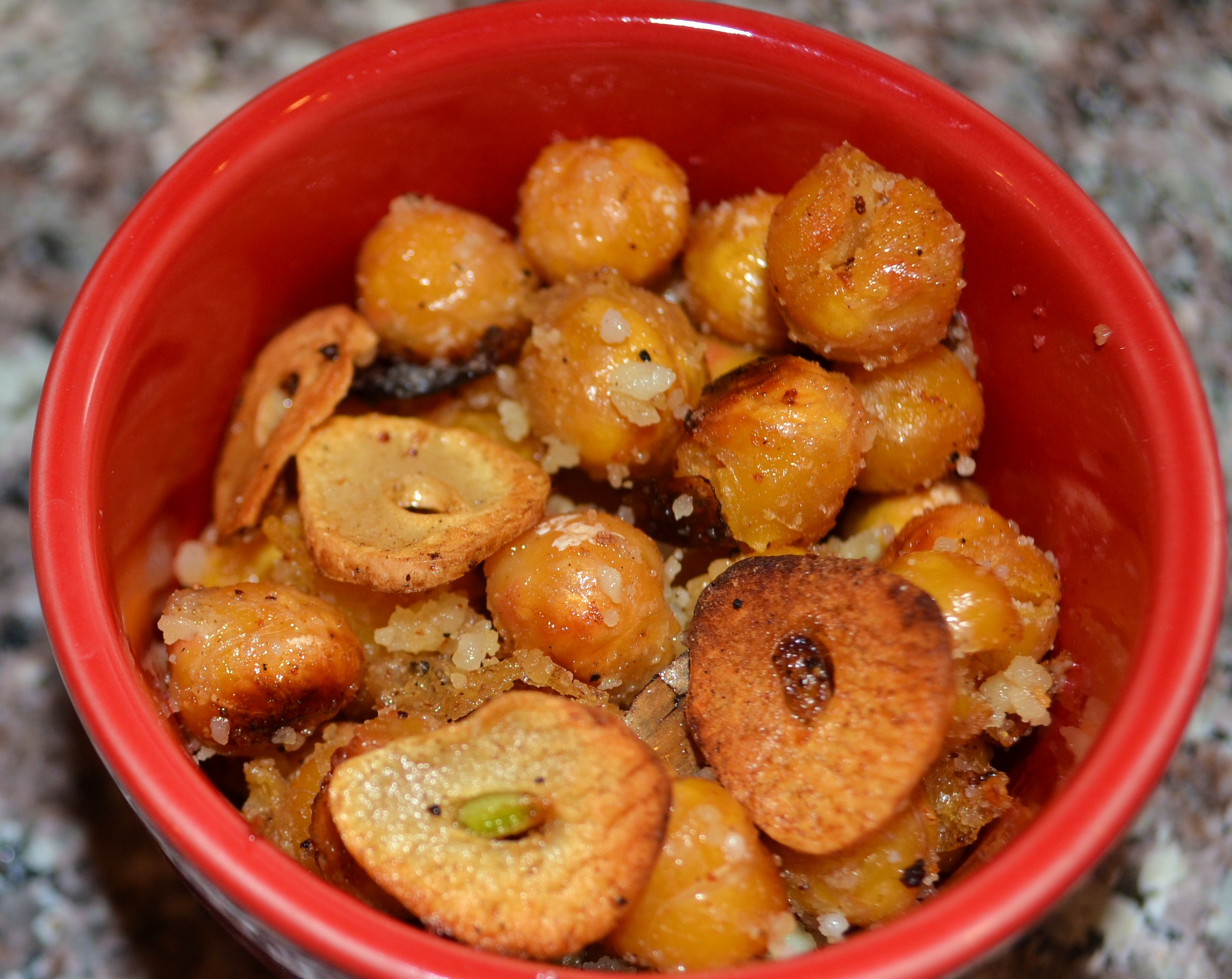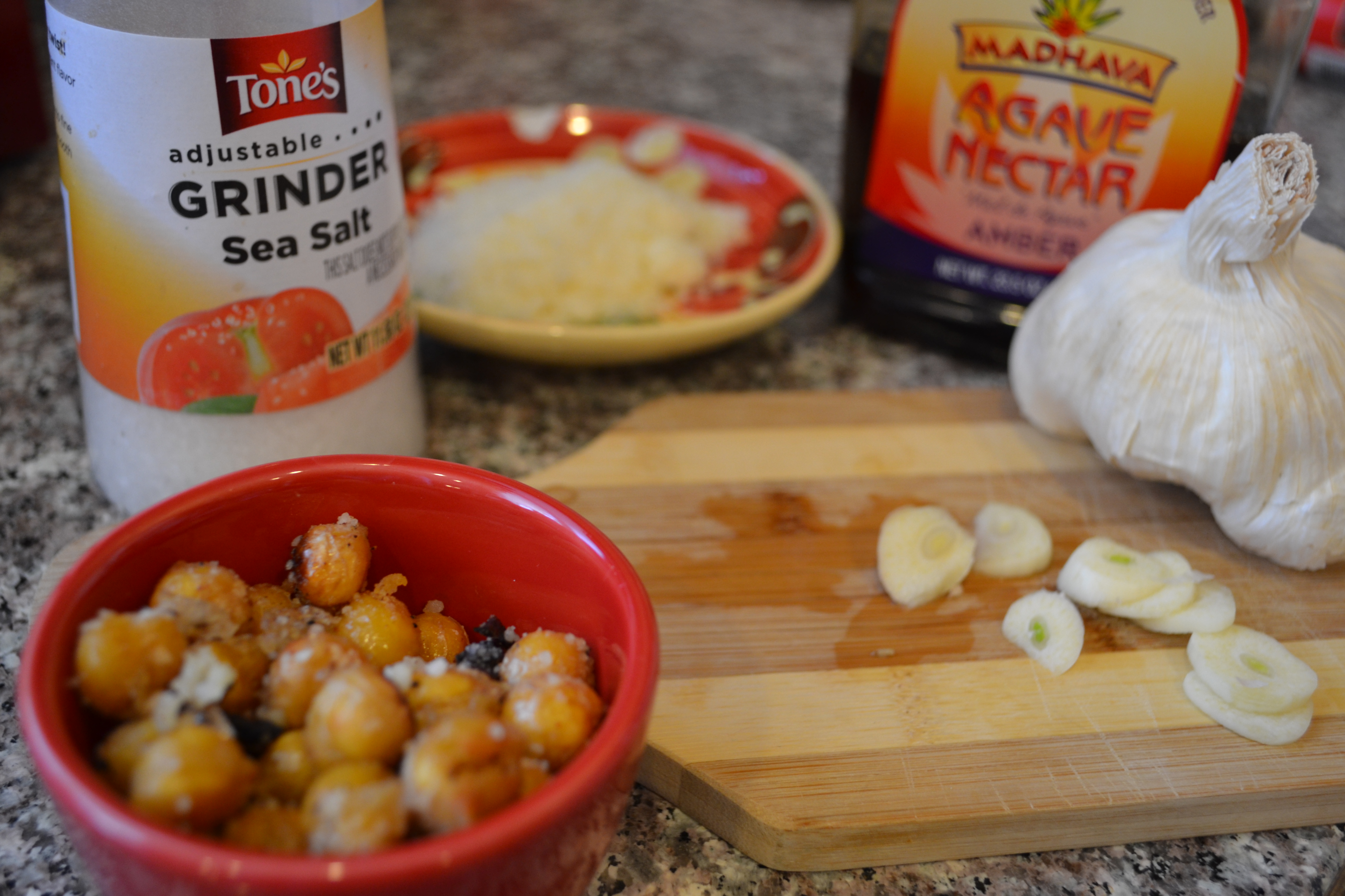Well, one idea led to another and by the time I finished, I created a snack that I could not stop eating until every single bean (or pea) was gone. It began when I decided to try sautéing the garbanzos in olive oil in my trusty iron skillet. Then I threw in some sliced fresh garlic near the end of the cooking time so they could turn a golden brown (but not burn) and add extra flavor and crunch. After draining them on a paper towel, I squiggled a touch of agave nectar over them to give the beans and garlic a light sweet, sticky surface then sprinkled them with sea salt and Parmesan cheese.