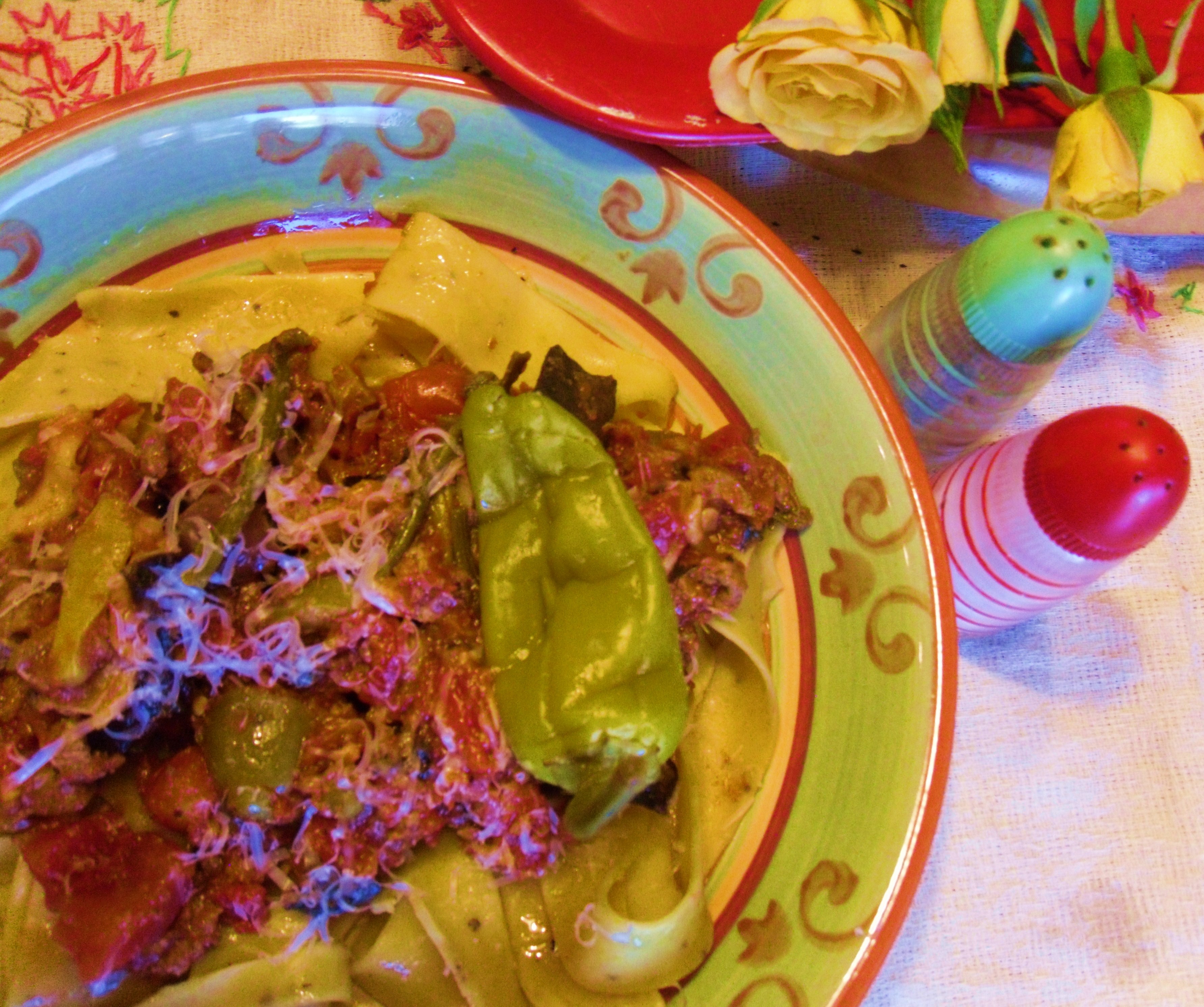 Posted: April 25, 2012 | Author: Becky Johnson | Filed under: Beef, Gluten Free, Main Dishes, Pasta, Vegan, Vegan Options, Vegetarian | Tags: capers, chick peas, garbanzo beans, marinara, olives, Papperdelle, pasta, pepperocinis, Puttanesca, spaghetti squash, Vegan Pastas |