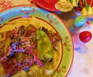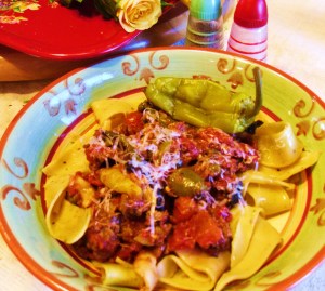 Posted: June 12, 2015 | Author: Becky Johnson | Filed under: Italian, Main Dishes, Pasta | Tags: cream cheese, garlic, marinara, meat, Pappardelle noodles, pasta, pot roast, steak, wine |