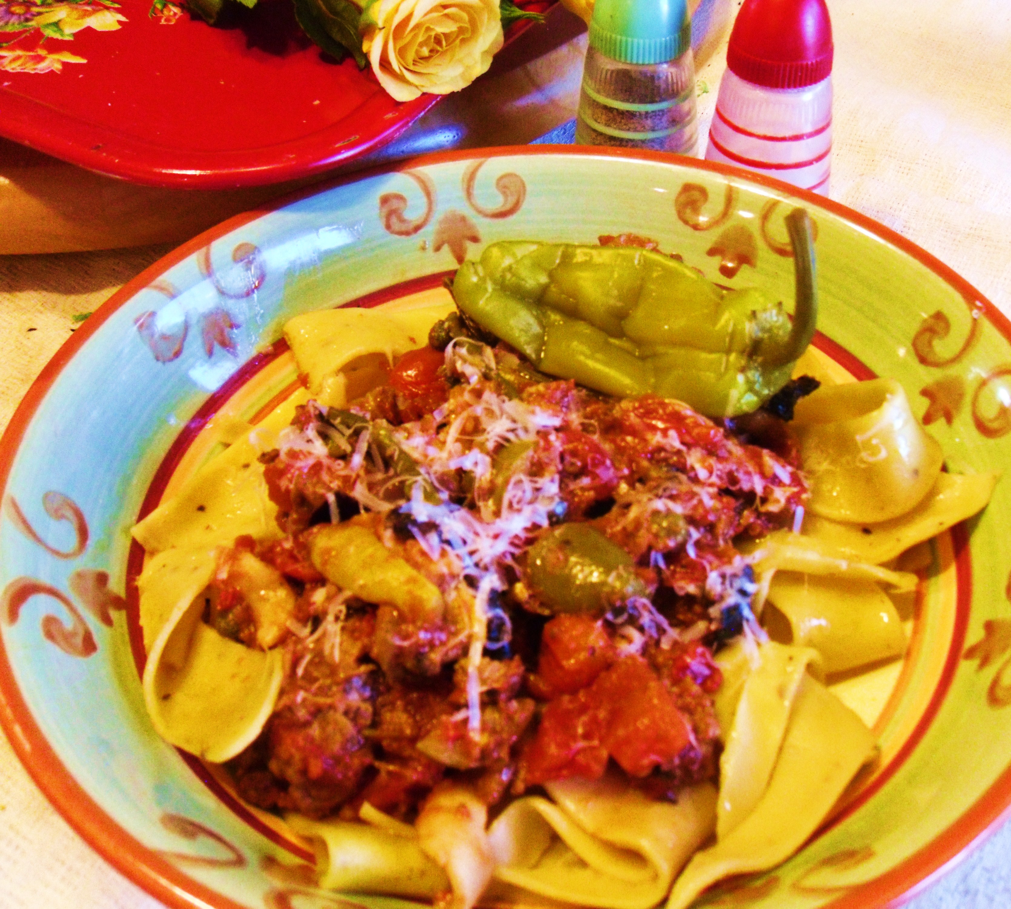 Becky’s Seductive Puttanesca Meat Sauce over Lemon-Pepper Pappardelle
