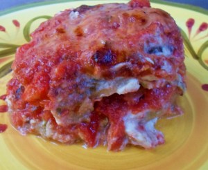 Grease a square pan or round pan with a little olive oil. Place one layer of eggplant in pan. (Using 1/3 of the eggplant slices.) Top with ½ the ricotta mixture. Top with 1 cup marinara sauce. Layer again with eggplant, ricotta, and marinara in the same portions. Top with layer of eggplant and final cup of marinara.