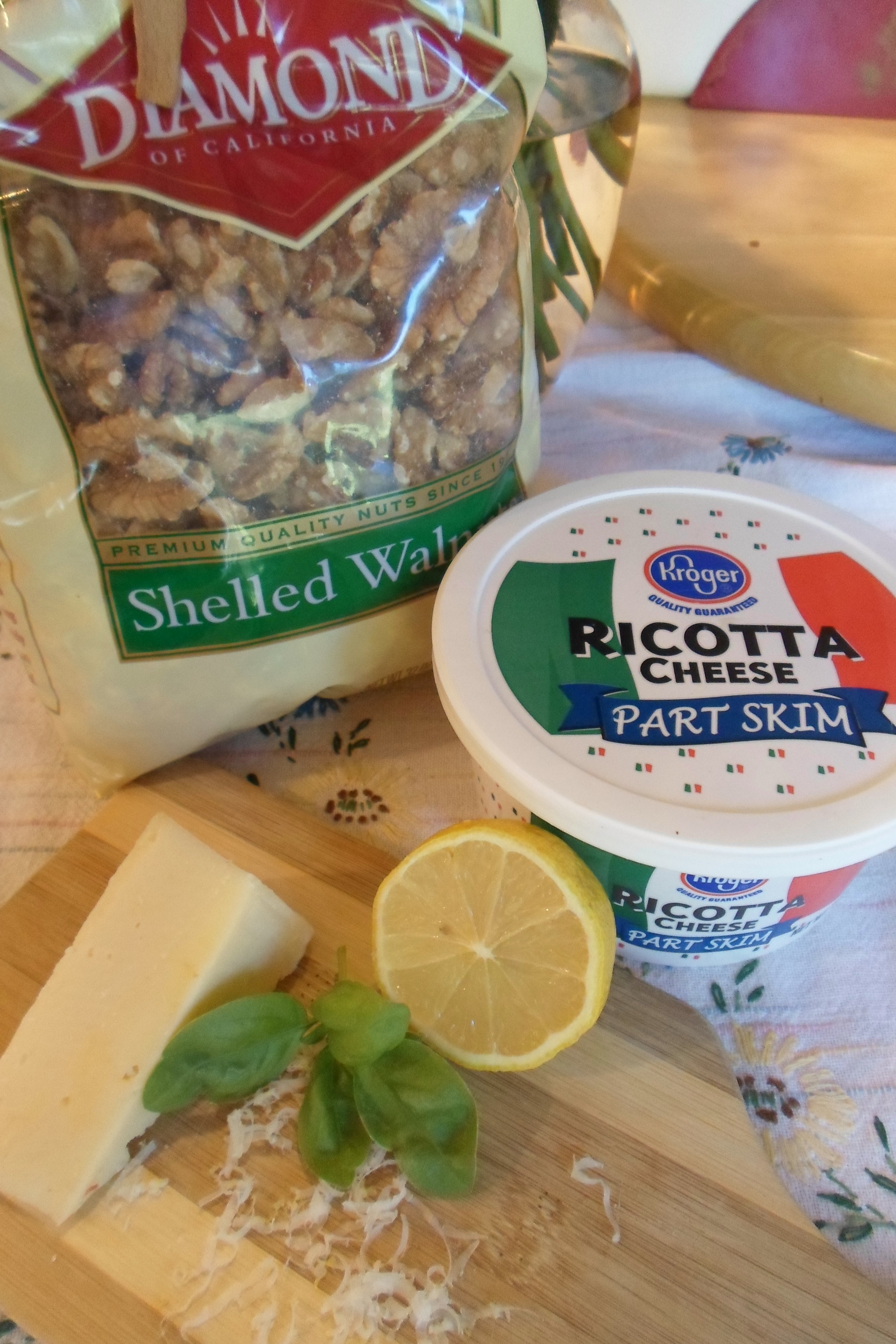 Though the kitchen was a disaster for awhile, I did produce several mouth-watering dishes. (Some to be shared in later posts.) The first dish I made was born from a love of the flavors in pesto, but discouragement with the pesto calories. I wondered what it would taste like to fuse all the ingredients in classic pesto with ricotta cheese, cutting out the olive oil. Part skim ricotta has a generous amount of protein while low in calories. I LOVED the results. Light, lemony and creamy with the crunch of walnuts, the zip of basil and garlic. With the addition of a little Greek Yogurt it made a wonderful dip for veggies and topping for crostinis. (Small slices of French bread, toasted, usually with olive oil.)
