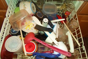 People ask, “Do your dishes get clean when you load them this way?” And I say, “Not all of them. But, miraculously, about 90 percent of them DO!” I can deal with the other 10 percent later, when I hurriedly run them through the dishwasher again.