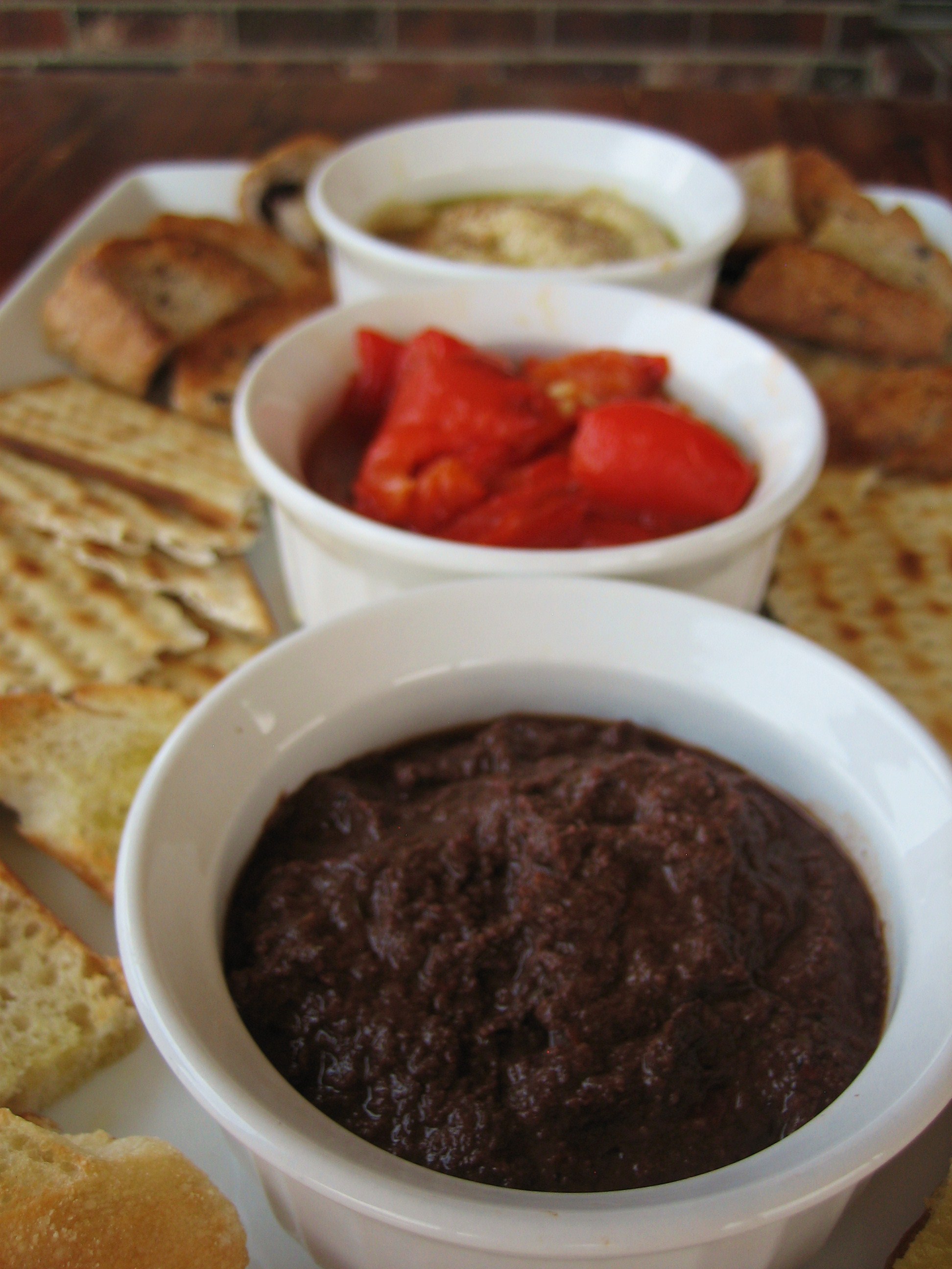 Posted: July 10, 2012 Filed under: Appetizers, Snacks, Uncategorized, Vegan, Vegetarian | Tags: appetizer trio, easy appetizers, garlic, greek, hummus, medetteranean, olive tapenade, olives, red peppers, roasted red peppers in garlic oil, vegetarian tapenade Leave a commentLast week on vacation, Jared and I celebrated our anniversary at this adorable little wine bistro and had the most beautiful flavorful appetizer trio of hummus, marinated roasted red peppers, and olive tappenade. Though I love olives, I’ve somehow never eaten or made tappenade. I’ve been missing out. I immediately knew I wanted to recreate this rich briny dip when I got home. In fact, I wanted to recreate the whole trio, maybe even the whole evening.