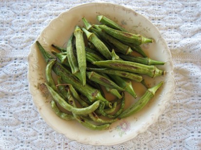 In our huge haul of garden veggies from Uncle, we had a small batch of fresh okra. I’ve been planning to fry them up, as any good southerner would do, but I’m not really the frying kind of gal. It’s just so messy.