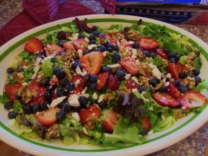 Posted: March 16, 2012 Filed under: Salads, Uncategorized | Tags: apples, berries, blueberries, easy salads, gluten-free, greens, lemon, light salads, olive oil, refreshing, salad, salads, spring salads, strawberries, summer salads, vegan, vegetarian, veggies, walnuts, winter salads 8 CommentsNot long ago, I enthusiastically wound up my Cuisinart salad spinner, a gift from my efficient salad-loving daughter. What I did not do was read the instructions, which I’m now guessing said something like, “Wait until the inner whirling colander comes to a complete halt before removing the lid.” If you remove the lid early in the spinning process, I can testify that you will immediately give your entire kitchen, including ceiling and floor, a certain lettuce-based Rain Forest look. However, if you use it correctly, a salad spinner is quite the nifty item to dry the lettuce mix for this recipe below, one of my favorite salads.