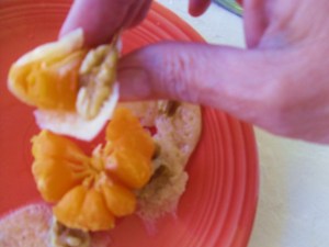 Needless to say, I’m totally in my Vacation Mind. So far today I’ve “cooked” a couple of bowls of cereal, a PBJ sandwich and peeled some string cheese and clementines. Not fancy fare worthy of food posting, really. But then, at Happy Hour time, I got inspired. I saw some Parmesan cheese and walnuts (I’d packed them in my carry-on from home), and a bowl of fresh Florida clementines (bought in haste from the local grocery last night.) Let me tell you, these Floridians really get premium citrus. These clementines are so juicy they nearly burst in your hands as you peel them. Naturally sweet and tangy. Oh my. When fruit is this good, you don’t want to do much to it. Just let Nature shine. So, on the fly I invented these Parm Cheese-Walnut and Clementine Appetizers. Salty, nutty, warm meets fresh, tangy, sweet and cold. So yummy.